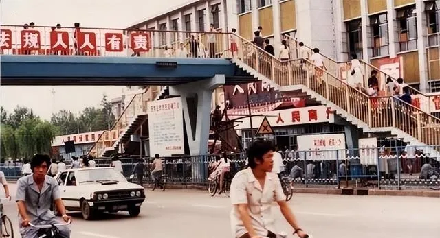 这张90年代的中山路过街天桥,一看就是当年的热闹地段。桥上有人走,桥下有自行车、有小轿车,后面的“人民商场”招牌也很显眼。最有时代感的,其实不是桥本身,而是桥两边那种老式栏杆、临街商店和路口的人流。现在天桥太常见了,可放在那时候,它真有点像一种城市升级的信号:人多了,车多了,路口也得重新安排了。