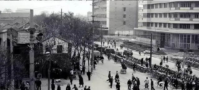 这张黑白照片特别耐看。左边还是低矮旧房,右边已经是现代感更强的楼,中间街面上人来人往,最醒目的却是一大片摆放得整整齐齐的自行车。那个年代,城市的秩序感常常就落在这些小地方上。谁家有辆永久、飞鸽、凤凰,擦得锃亮,停好了还要回头看一眼。别看只是停车,那个年代的生活味儿一下就出来了。