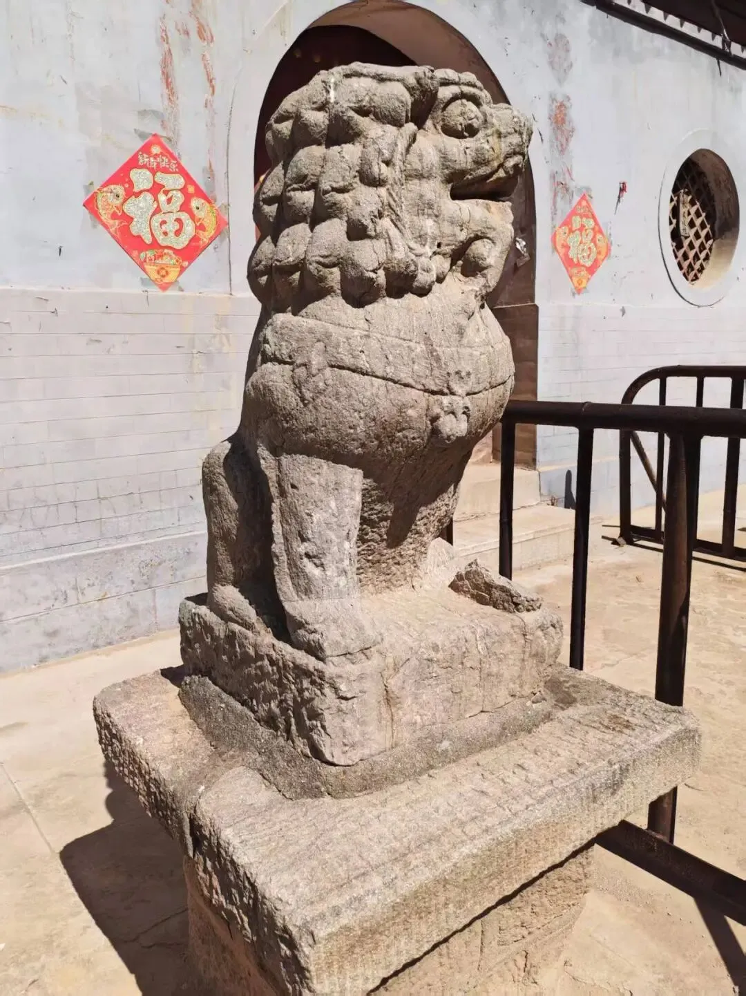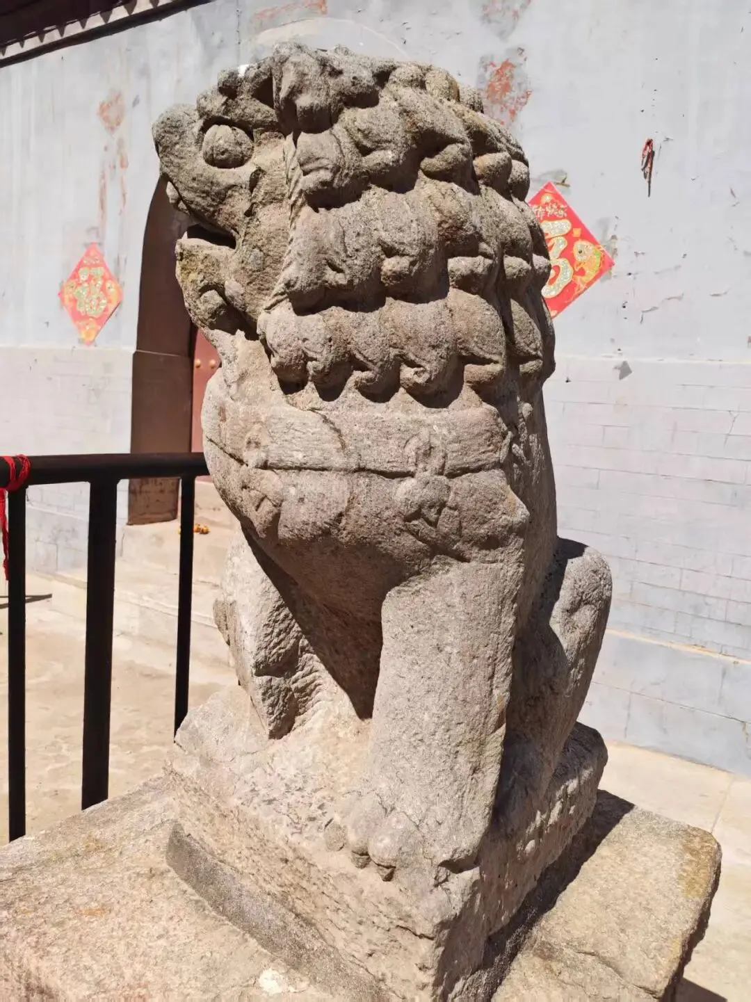 再往上走,寺门左右有一对石狮,接近于当代石狮造型,且风化程度较小。这对石狮没有唐代的雄健,没有宋代的清秀,比较“程式化、世俗化”,是明清风格的石狮。