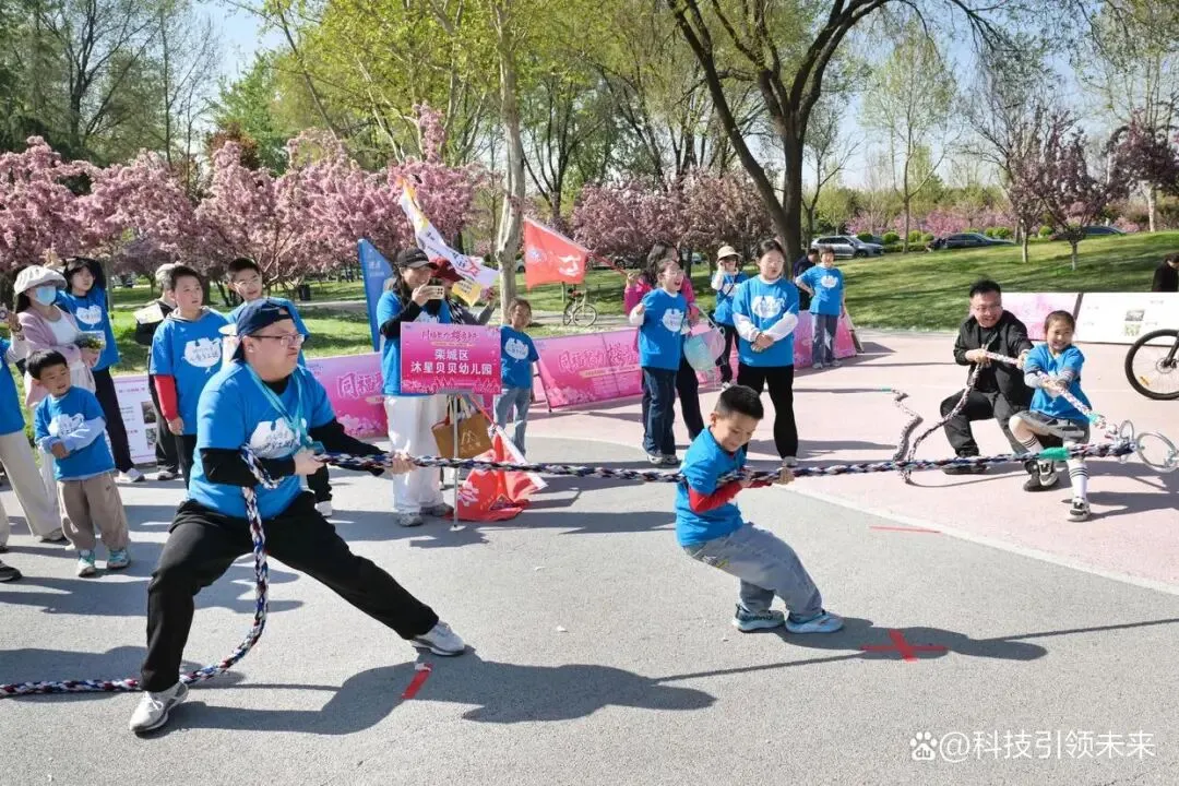 除了竞技拔河比赛,还设置了“踏樱寻趣”活动。由亲子家庭3人组、情侣2人组等参加拔河趣味活动。