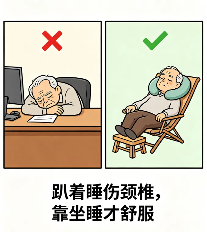1.别趴着睡:好多叔叔阿姨喜欢趴在桌上午睡,这样会压迫颈椎和眼睛,醒了之后脖子疼、眼睛花。最好是躺着睡,没有条件的话,就靠在椅子上,头往后仰,闭上眼睛歇会儿。