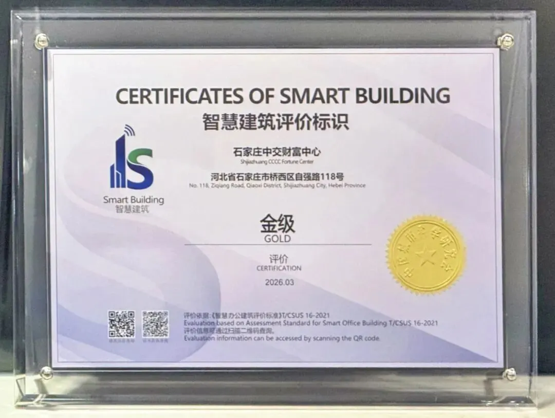 此次斩获智慧建筑评价标识金级认证,既是对项目智慧化建设成果的高度肯定,也是项目高质量发展的重要里程碑。石家庄中交财富中心始终将前沿智慧技术与建筑设计、运营服务深度融合,构建起全流程智能管理体系,为入驻企业提供高效便捷、安全舒适的办公环境,致力打造成为石家庄高端商务新地标,助力城市商务能级提升。