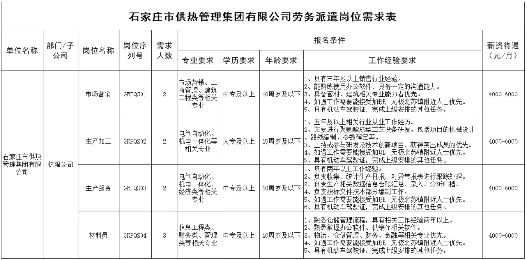 根据工作需要,石家庄市供热管理集团有限公司特委托石家庄市国经人力资源管理有限公司面向社会公开招聘劳务派遣制人员9名。现将具体招聘事宜公告如下:
