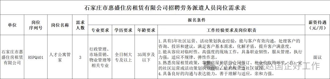 【石家庄招聘】石家庄市惠盛住房租赁有限公司招聘公告