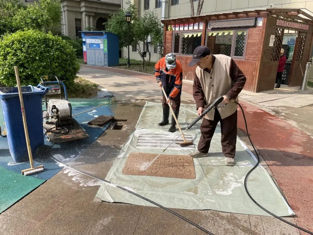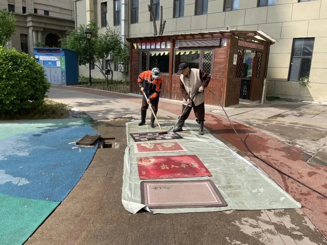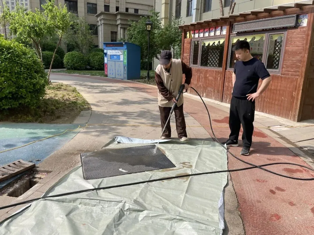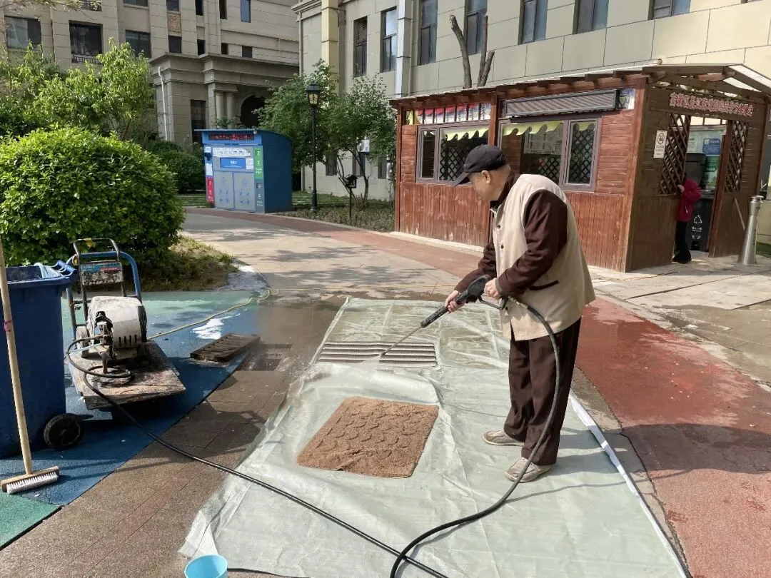 活动现场暖意融融,物业工作人员早已备好高压清洗机、环保清洁剂、长柄刷子等专业工具,分工明确、默契配合,有条不紊地开展清洗工作——喷洗、刷洗、冲洗、晾晒,每一个环节都细致入微,不放过任何一处顽固污渍,用专业与用心,守护每一份洁净。