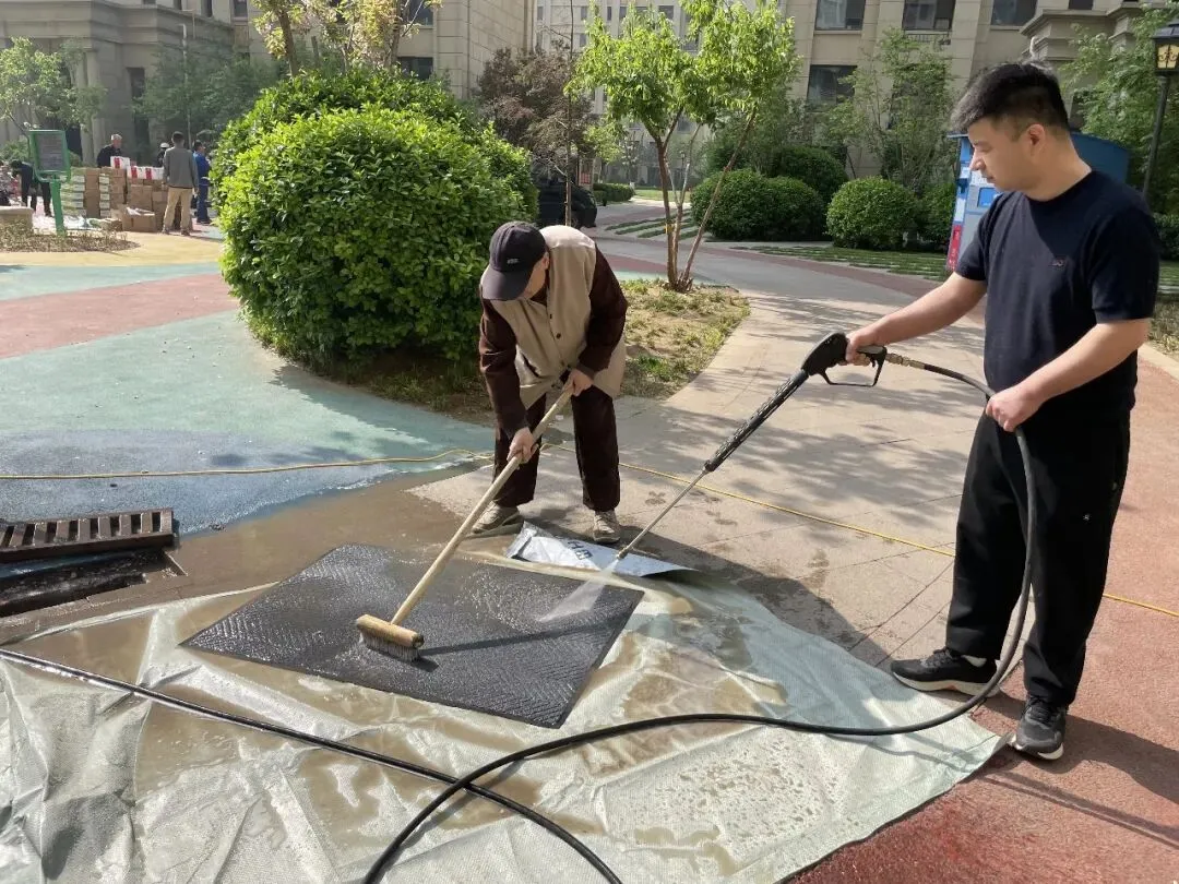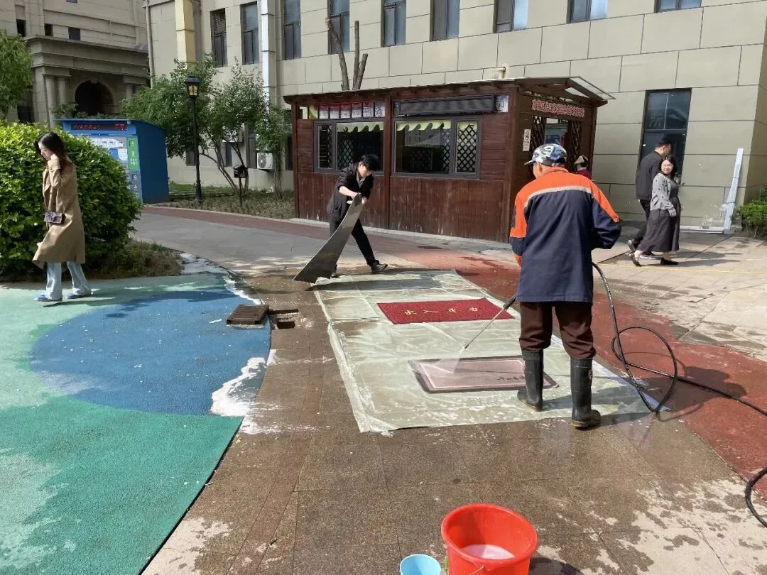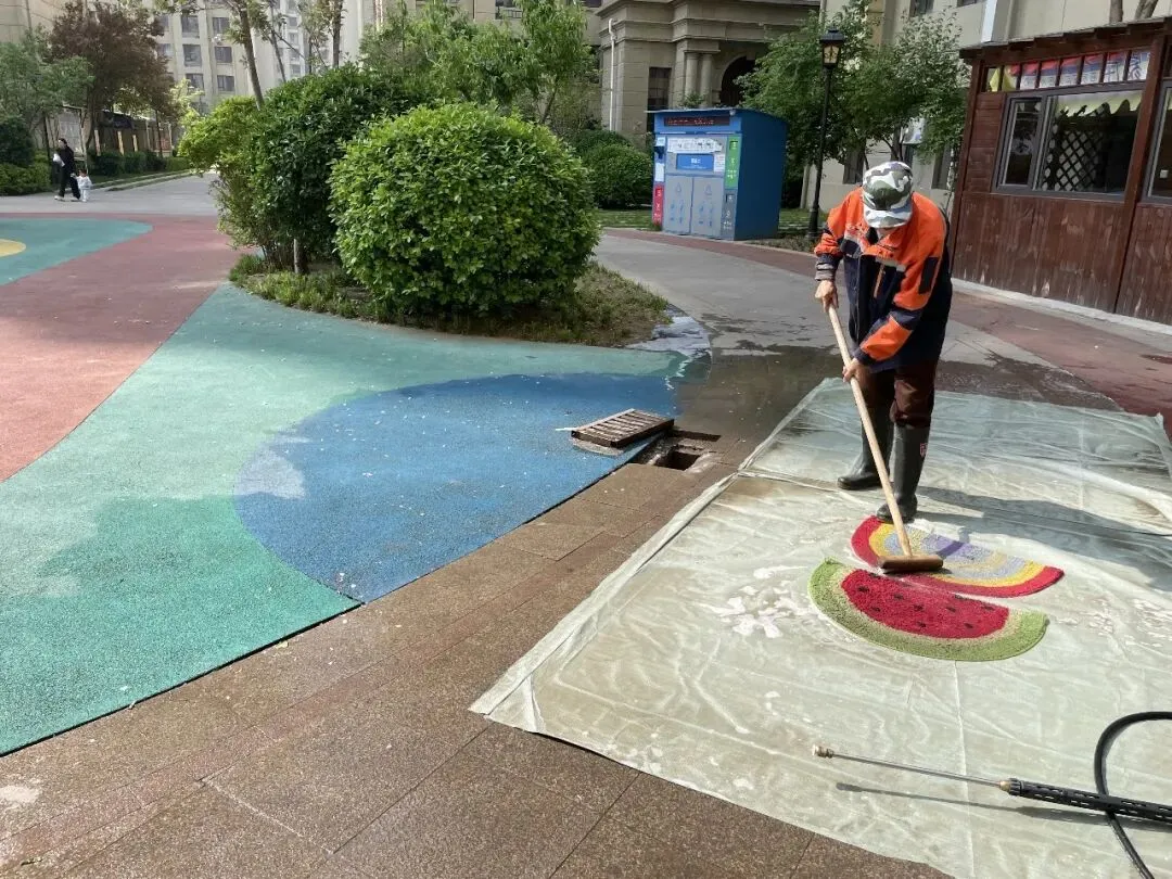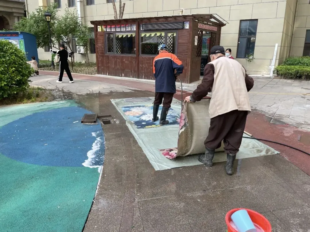 活动现场暖意融融,物业工作人员早已备好高压清洗机、环保清洁剂、长柄刷子等专业工具,分工明确、默契配合,有条不紊地开展清洗工作——喷洗、刷洗、冲洗、晾晒,每一个环节都细致入微,不放过任何一处顽固污渍,用专业与用心,守护每一份洁净。