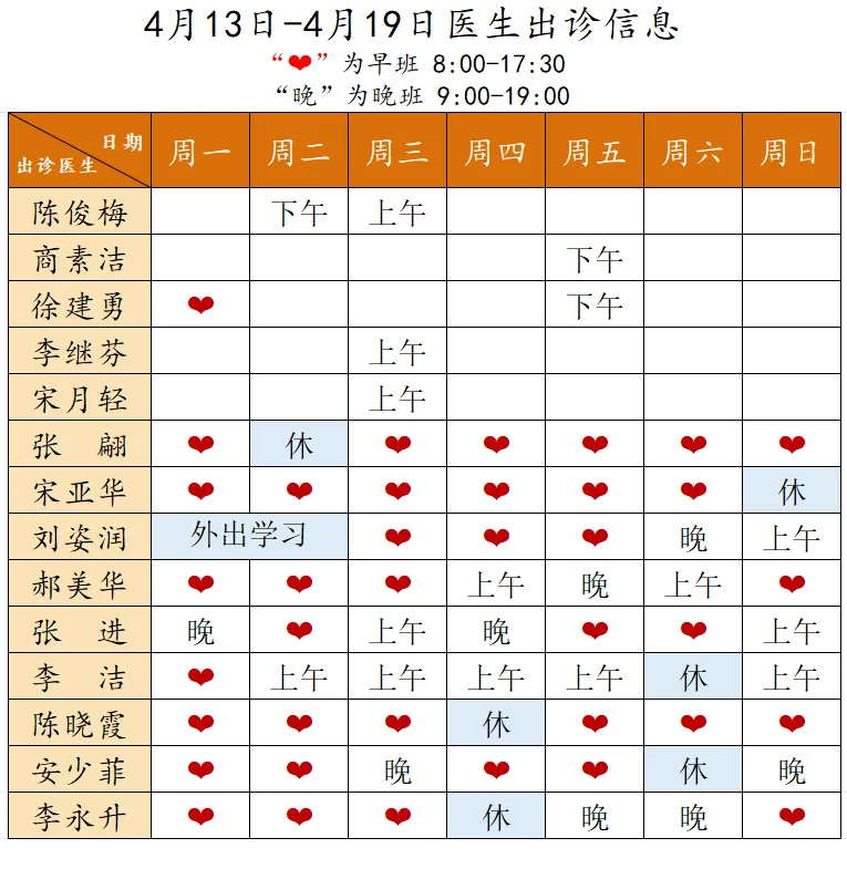 【出诊信息】4月13日-4月19日石家庄杏林中西医结合医院医生出诊表