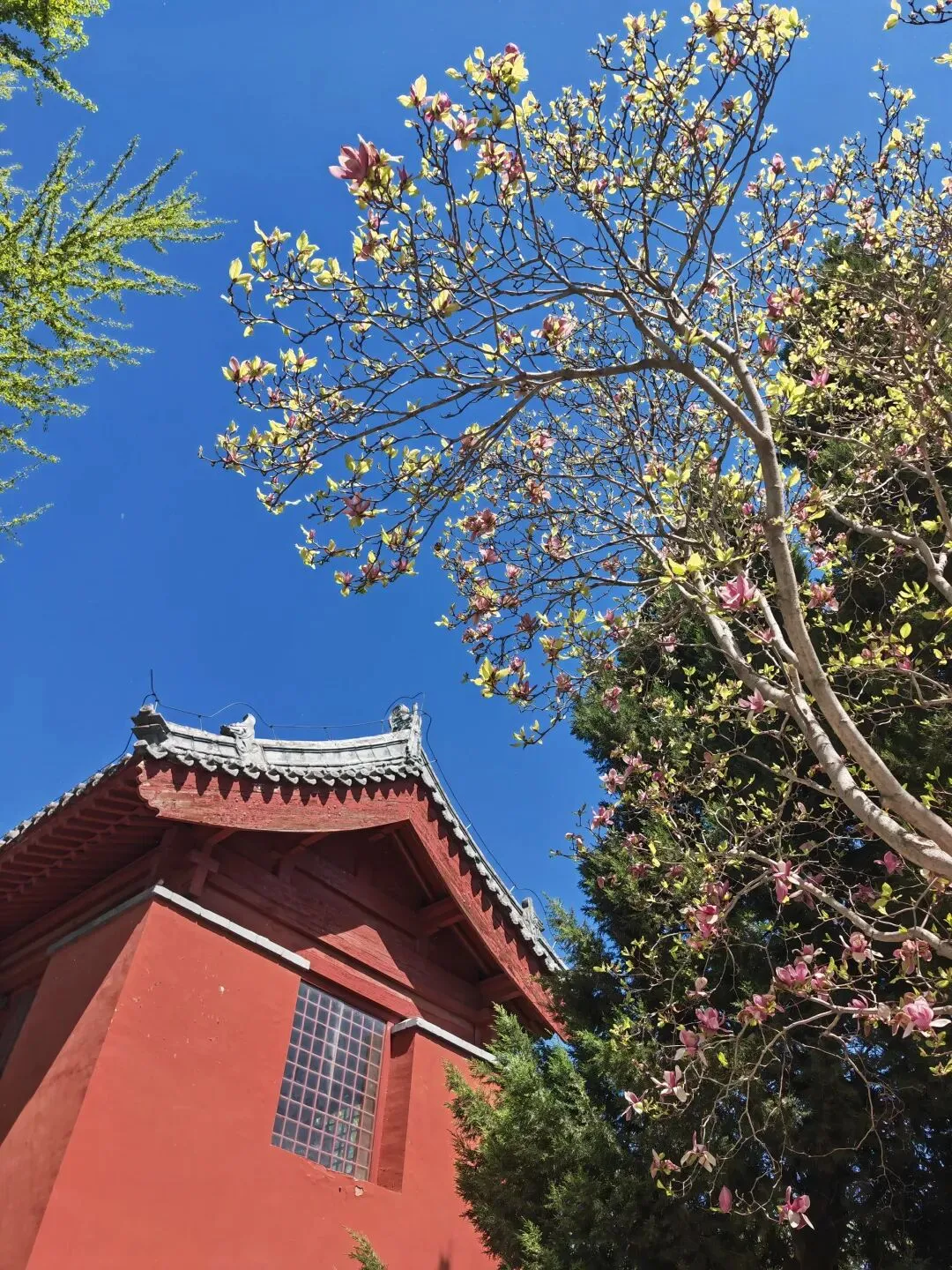 步出展厅,仍觉意犹未尽。环顾寺内,草木透着新绿,青砖地面润得发亮,红墙灰瓦在微风中更显韵律。几株唐柏苍劲挺拔,树皮纹路如浮雕,历经千年风雨依旧枝繁叶茂,与古寺、壁画相映成趣,诉说着岁月的悠长。偶有虔诚的香客轻步走过,行礼如仪,平添了几分佛国意象。