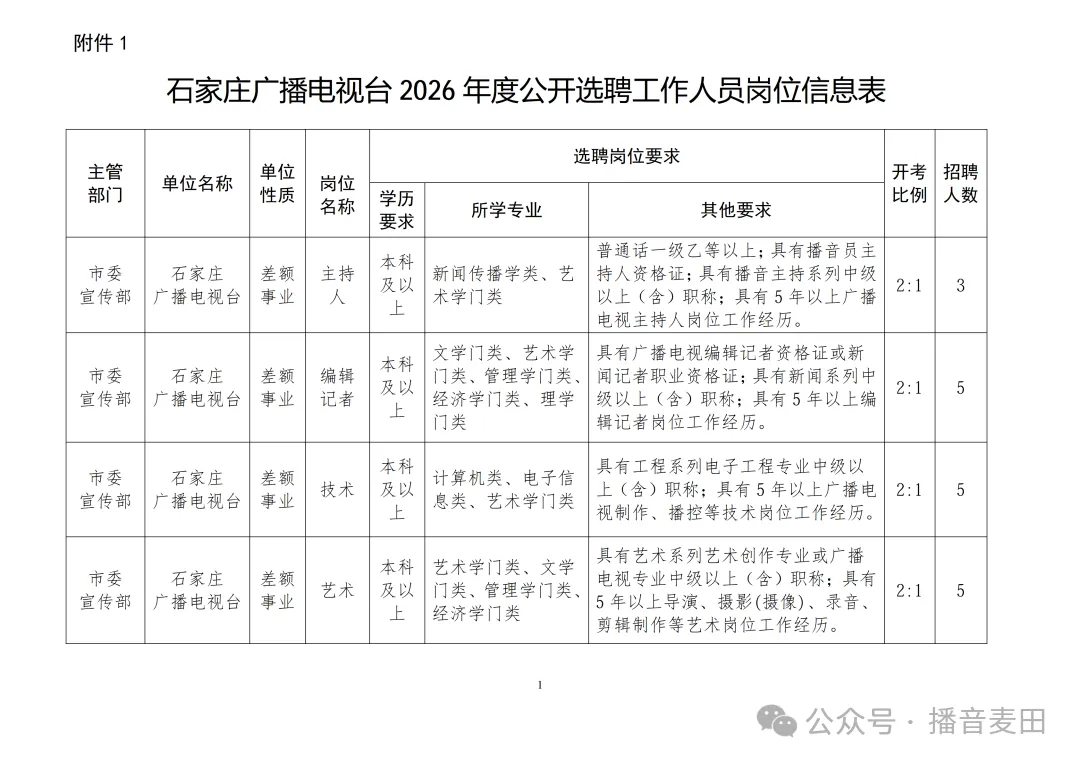 附件:《石家庄广播电视台2026年度公开选聘工作人员岗位信息表》