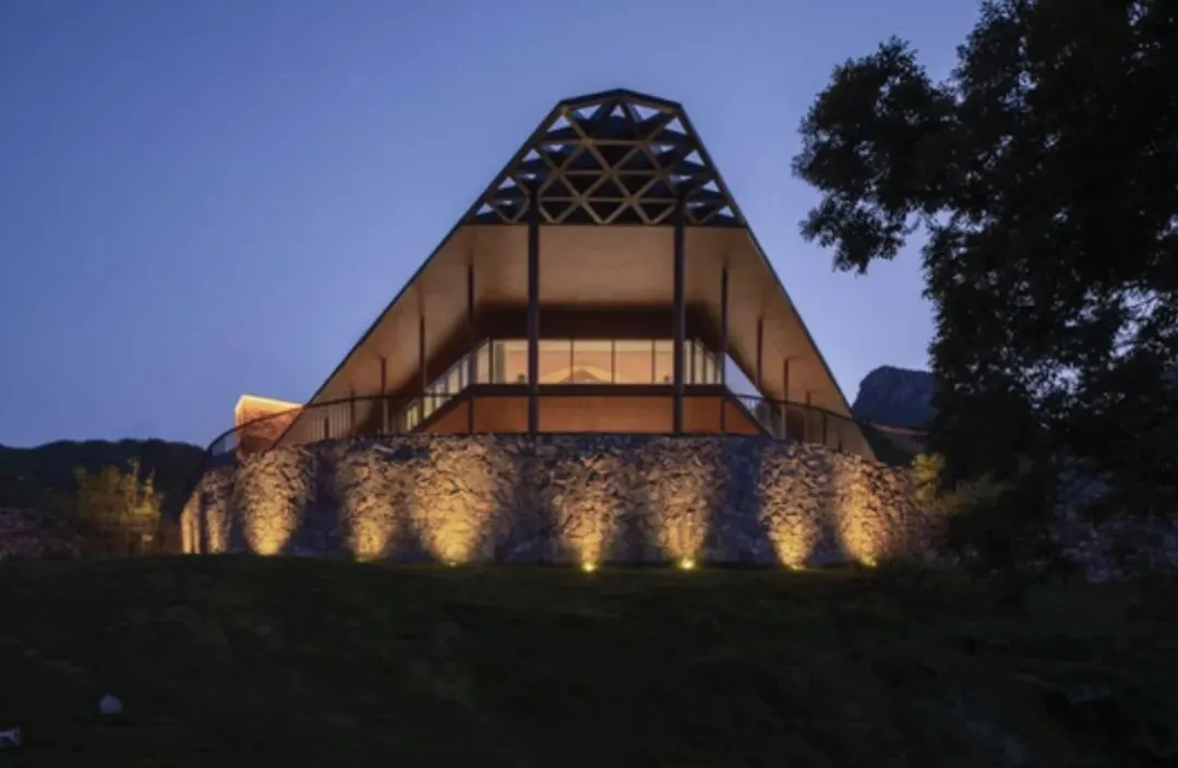 建筑内部围绕着一个三角形的采光天井展开。正午时分,阳光穿过屋顶玻璃天窗,透过落叶装置倾泻而下,照亮最底层的追思厅小院。这一束光连接天地,营造出圣洁清明的仪式感,让生者得以疗愈悲伤,逝者得以安息永存 。