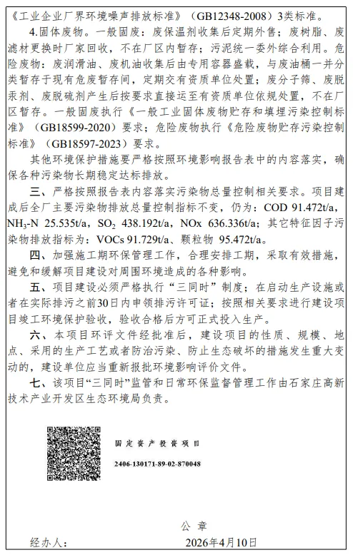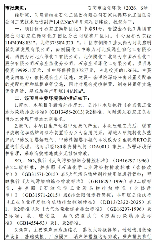 关于晋控金石化工集团有限公司石家庄循环化工园区分公司工艺技术改造副产1.4亿Nm³/年甲烷项目环境影响报告表的批复审批决定公告