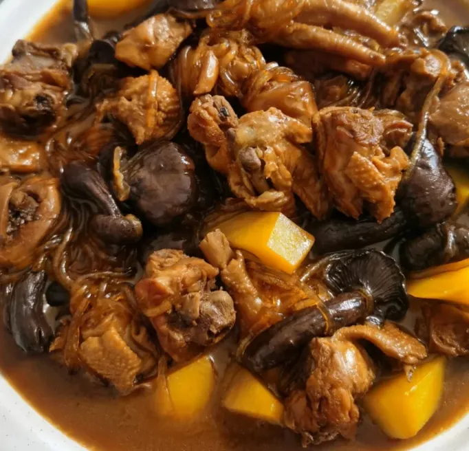柴鸡炖蘑菇做法其实不玄。鸡块先下锅炒出油,再放葱姜蒜和酱料煸香,添水慢炖,最后把本地蘑菇放进去收味。火候到了,汤不需要太多调味,自然就鲜。不是靠重口提着你走,而是一口一口,把人慢慢安顿住。