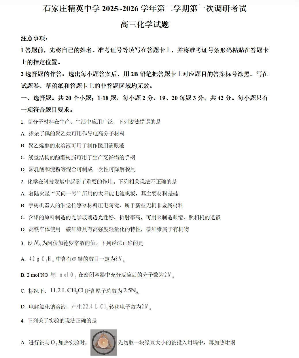 河北石家庄精英中学2025-2026学年第二学期第一次调研考试高三化学试题