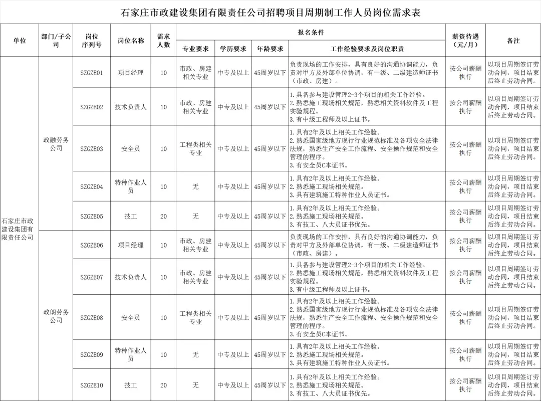 石家庄市政建设集团有限责任公司招聘120名项目周期制工作人员公告