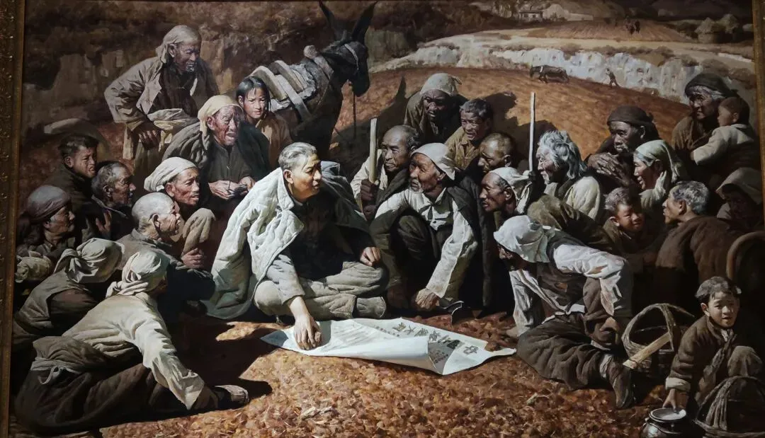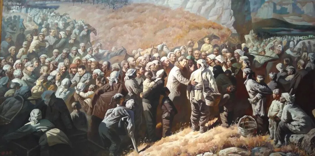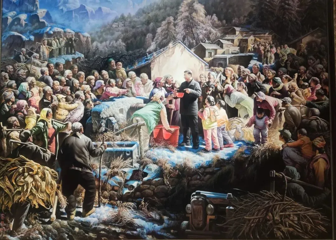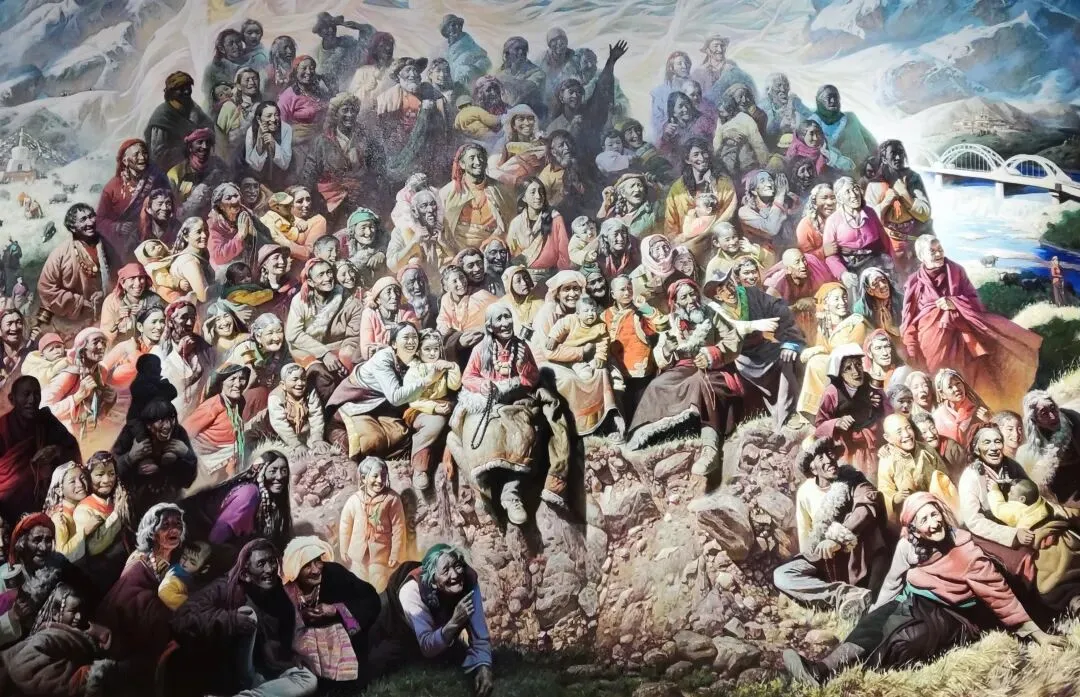 石家庄美术馆集美术展览、收藏研究、公共教育、文化交流于一体,重点展示河北及全国美术精品,推动本土艺术发展。 石家庄美术馆序厅是是馆内的核心公共空间,用于展览开幕、文化活动等。石家庄美术馆拥有10个专业展厅,常设展包括陈承齐艺术展厅(6号厅)、珍宝厅(10号厅),其余展厅(1-5号、7-9号)以临时展览为主,涵盖国画、油画、书法、篆刻、非遗、当代艺术等多元主题。 这幅油画还原了西柏坡时期的关键历史:1948年5月至1949年3月,中共中央在西柏坡指挥了决定中国命运的辽沈、淮海、平津三大战役,彻底摧毁了国民党军的主力,为新中国成立奠定了军事基础。陈承齐是河北本土艺术家,其西柏坡系列油画以宏大的历史叙事、细腻的写实技法,成为中国红色美术的经典作品。石家庄美术馆专门设立常设展厅,永久展出其作品,是馆内最具代表性的红色文化展陈。 1949年3月23日,中共中央从西柏坡出发,前往北平筹建新中国。毛泽东将此行喻为“进京赶考”,寓意“决不当李自成”,要跳出历史周期率,建设一个人民当家作主的新中国。 通过对“送别”这一温情场景的描绘,将军民情谊与“进京赶考”的历史使命融为一体,既展现了中国革命的人民性,也凸显了中国共产党人的初心与担当。 1947年,中共中央在西柏坡颁布《中国土地法大纲》,明确“废除封建性及半封建性剥削的土地制度,实行耕者有其田”。这幅油画正是对这一历史变革的艺术再现,土地改革彻底解放了农民,为解放战争的胜利奠定了坚实的群众基础。 画面以太行山区冬日山村为背景,用超百人的宏大群像构图,还原了领导人深入基层、与乡亲们亲切互动的场景。习近平总书记在井边,接过乡亲递来的水,周围簇拥着老中青幼各年龄段的山区群众,神态真挚热烈,生动诠释了“人民就是江山,江山就是人民”的核心主题。 画面以青藏高原为背景,刻画了涵盖老中青幼全年龄段的藏族群众,人物身着色彩鲜艳的传统藏装,佩戴藏式饰品,神态喜悦真挚,展现出藏族同胞的淳朴与幸福。