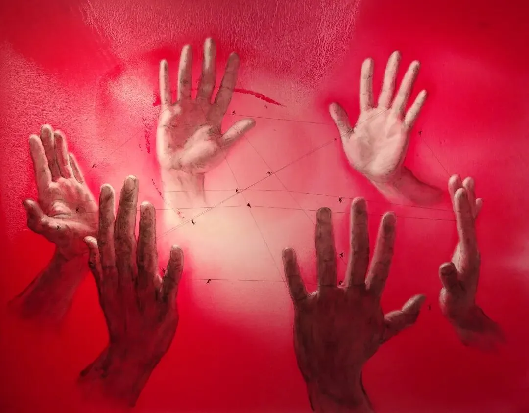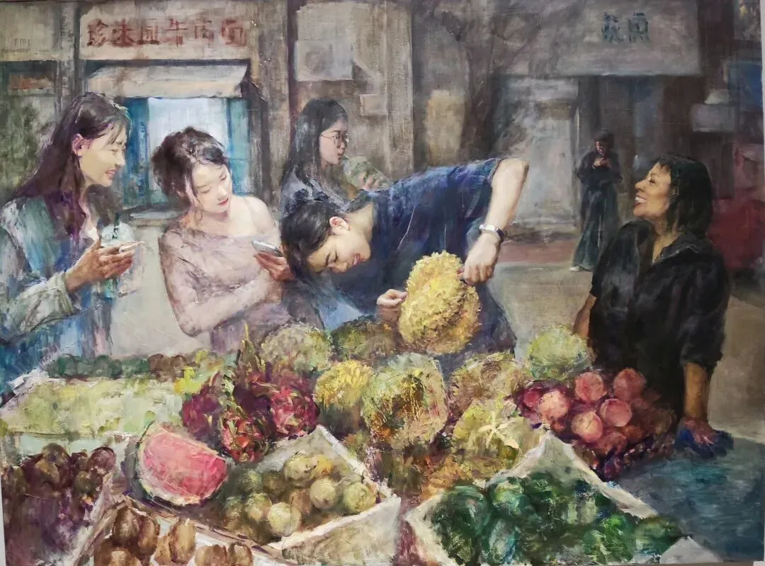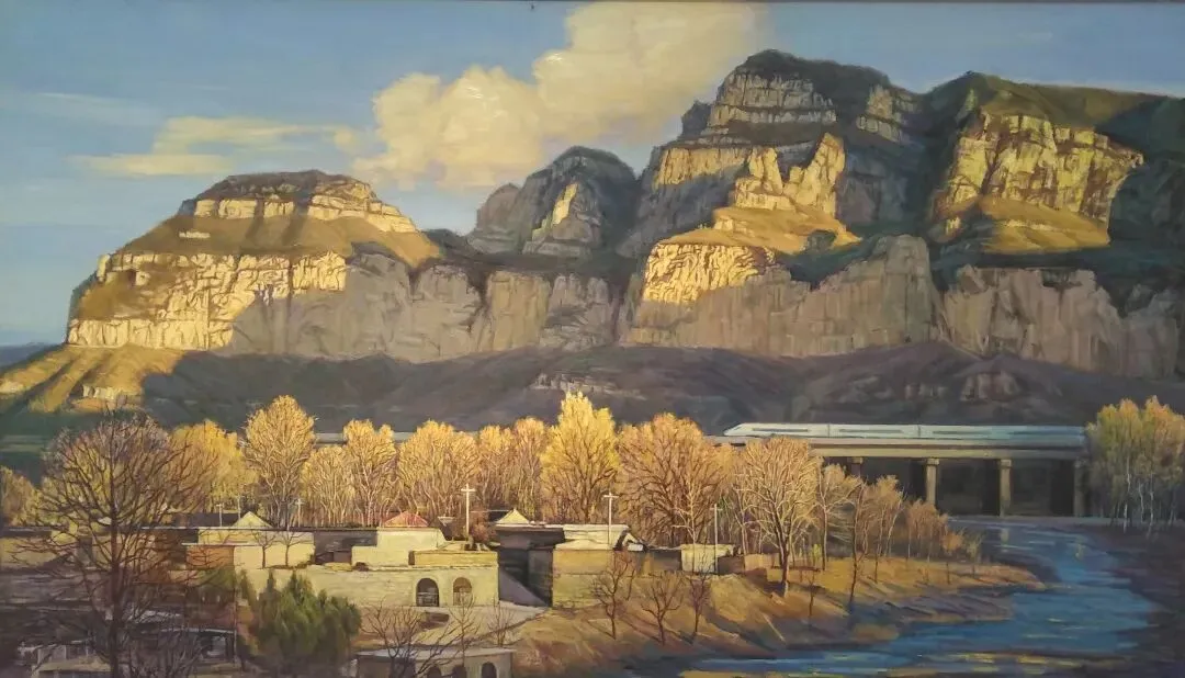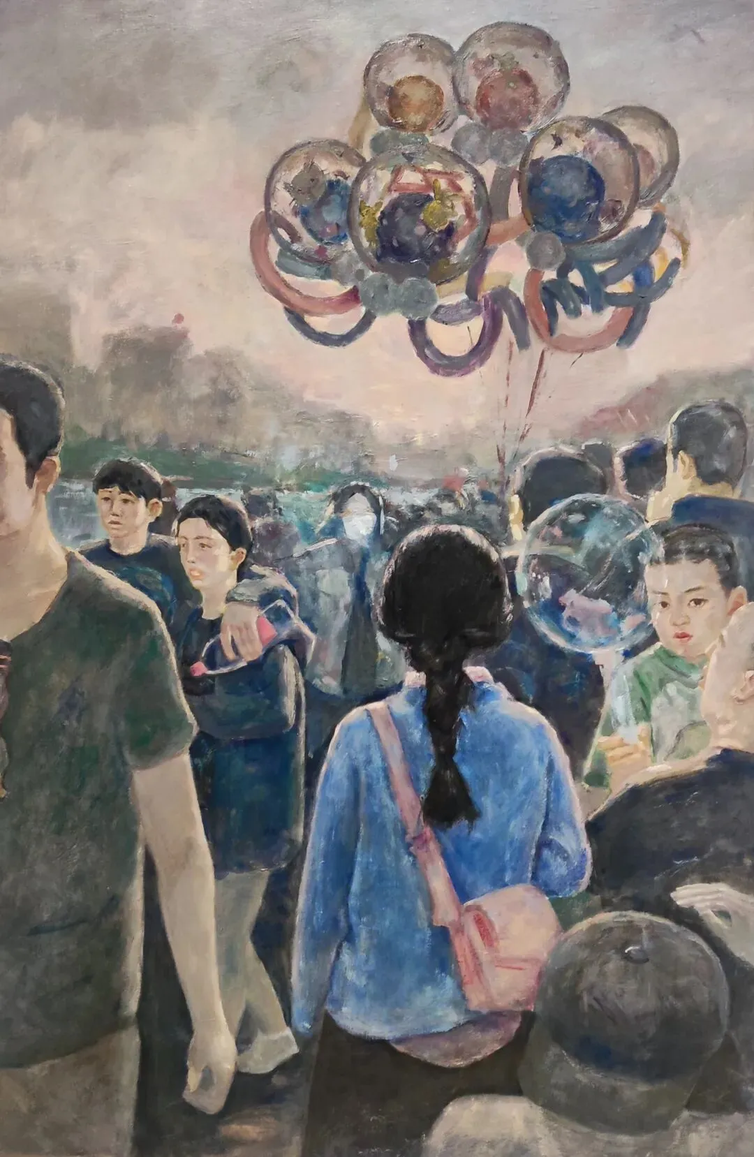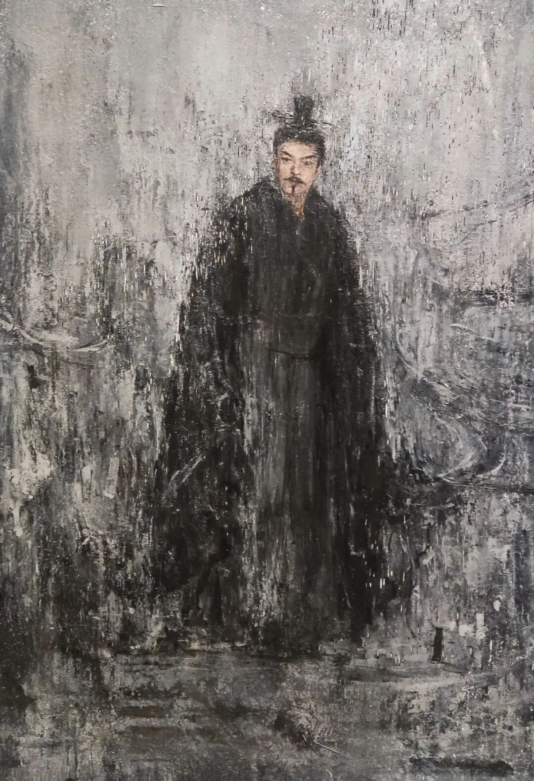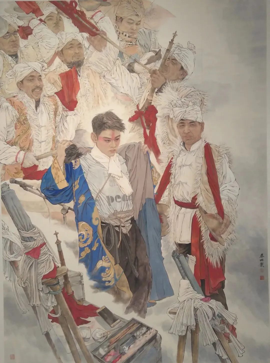画面中心是身着黑色宽袖深衣、头戴先秦冠冕的秦始皇,面容冷峻威严,眼神锐利,精准还原了史书中“蜂准、长目、挚鸟膺”的帝王形象;以混沌、苍茫的灰调背景,营造出“天地苍茫、唯我独尊”的空间感,呼应秦始皇“扫六合、定天下”的历史伟业,强化了人物的孤独与威严。采用写意写实结合的技法,以厚重的黑白灰为主色调,用粗犷的笔触、斑驳的肌理营造出历史的沧桑感与厚重感,弱化细节、强化气场,凸显人物的磅礴气势。 “醉仙”是中国传统书画的经典母题,核心文化寓意是以醉酒的状态,象征对世俗束缚的挣脱、对自由精神的追求,是文人“出世”思想的艺术表达;常见题材包括“饮中八仙”、“酒仙”,以及道教仙人,这幅作品以三位仙人的形象,是该题材的经典演绎。 该画在线条上以写意减笔为主,用顿挫有力的墨线勾勒人物轮廓与衣褶,寥寥数笔便塑造出人物的动态与神韵,符合“以形写神”的国画理念;用墨干湿浓淡层次丰富,以浓墨绘须发、衣袍,淡墨晕染云雾,墨色变化赋予画面极强的节奏感与立体感;色彩上采用淡彩写意,仅以浅蓝、赭石、淡蓝等少量色彩点缀头巾、酒盏、葫芦,以墨色为主体,既保留水墨韵味,又提亮画面。 鲁迅以全身立像占据画面视觉中心,身着民国时期的针织开衫、格纹马甲、白衬衫,搭配皮带与皮鞋,造型硬朗挺拔,一手叉腰、一手自然下垂,目光坚毅,神态冷峻,精准还原了鲁迅“骨头最硬”的精神气质。以泼墨、线刻结合的手法,刻画了战乱、苦难、抗争的群像场景,包含挣扎的民众、挥舞的武器、破碎的环境,以水墨淋漓的泼洒与淋漓的墨痕,营造出动荡、压抑的时代氛围,与前景鲁迅的沉稳形成强烈对比,凸显其“以笔为刃、唤醒民众”的精神内核。 采用对称式透视构图,以道路为中轴线,人物居于视觉中心,两侧林木对称延伸,既稳定了画面结构,又强化了“归家之路”的仪式感与纵深感。以冷色调的蓝、灰、白为主,搭配暖黄色的阳光与土地,冷暖对比既突出了北方冬日的清冷,又以暖光赋予画面温情,精准传递出“归途”的冷暖交织——旅途的寒凉与归家的温暖。 芭蕉是中国传统文人画的经典意象,象征“清幽、高洁、诗意”,与美人的组合是东方美学的经典母题。这幅作品以油画语言重构这一母题,融合了东方意境与西方写实技法。画面传递出“人景合一”的东方美学,人物的清冷与芭蕉的清幽相互映衬,营造出“林下美人”的诗意氛围,表达了对自然、纯净、自由之美的追求。采用主次分明的虚实构图,前景演员为视觉焦点,背景群像以虚化、层叠的方式呈现,既突出主体,又以群像烘托出社火的宏大场面,营造出强烈的空间纵深感。以云雾状淡墨晕染背景,将人物自然串联,既区分了前后层次,又烘托出民俗活动的热烈氛围感。 锅庄舞,又称“果卓”“歌庄”,藏语意为“圆圈舞”,是藏族最具代表性的民间舞蹈之一。舞蹈时民众围成圆圈,边歌边舞,节奏明快、动作豪放,是藏族人民节庆、聚会时的核心活动,承载着藏族的历史、文化与精神信仰。 这幅作品以写意的笔墨,将这一鲜活的民俗场景定格,成为连接传统与当代、民族与大众的艺术桥梁。 画面以拥挤的人群为核心,营造出热闹、充满烟火气的市井氛围,仿佛是公园、庙会或城市广场的日常场景;上方的网红透明波波球气球是绝对的视觉中心,气球内的卡通图案、彩色装饰在灰调的人群中格外醒目,点明了当代生活的时代特征。整体采用灰调的莫兰迪色系,用柔和的光影塑造空间感,仅以气球的亮色、人物衣物的色彩做点缀,既写实又富有艺术氛围感。 作品捕捉了普通人日常购物的瞬间,将平凡的市井生活升华为艺术,传递出“人间烟火气,最抚凡人心”的温暖主题;背景的店铺招牌、人物的手机等细节,融入了当代生活元素,是当下城市生活的生动缩影;摊主与顾客的笑容、朋友间的闲聊,展现了市井生活中人与人之间的温情与善意。 手掌是人类行动、创造、触碰的象征,代表着个体的力量与存在;串联的线条与小人,隐喻着现代社会中人与人之间无形的社会网络、情感联结与命运羁绊;深浅手掌的对比,象征着可见与不可见、现实与虚拟、个体与集体的二元关系。 每只手掌既是独立的个体,又被网络束缚,探讨了现代社会中个体的自由与归属;网络结构也可解读为权力、规则、科技对人的无形操控,引发对现代性的反思;红色背景象征着生命、激情与冲突,手掌的张力传递出人类在世界中的挣扎与抗争。 采用侧逆光(夕照),让山体向阳面呈现暖金色,背阴面形成深邃阴影,强化了太行山的立体感与雄浑感;山体用厚重、奔放的笔触塑造岩石肌理,树木与建筑用细腻笔触刻画细节,刚柔并济。以暖黄、赭石为主色调,搭配天空的冷蓝与河流的冷色,冷暖对比鲜明,既还原秋日氛围,又突出视觉焦点。 作品精准捕捉了嶂石岩地貌的核心特征:赤壁丹崖、层状断崖,是河北太行山的标志性视觉符号,具有强烈的地域辨识度;以“山水倒影”的对称构图,诠释了“天人合一”的东方美学,将太行的雄奇与湖水的柔美融为一体,展现了自然的和谐之美;停泊的游船作为人文元素,为山水增添了生活气息,传递出“山水为邻,岁月安然”的意境,是当代人对自然诗意生活的向往。 以“瑞雪”为意象,传递“瑞雪兆丰年”的吉祥寓意,同时展现太行山冬日的雄浑壮美,彰显燕赵大地的山河气魄;画