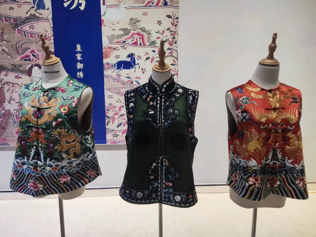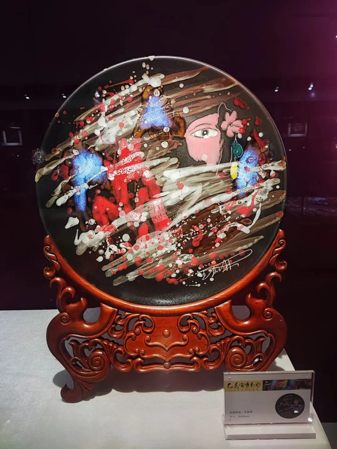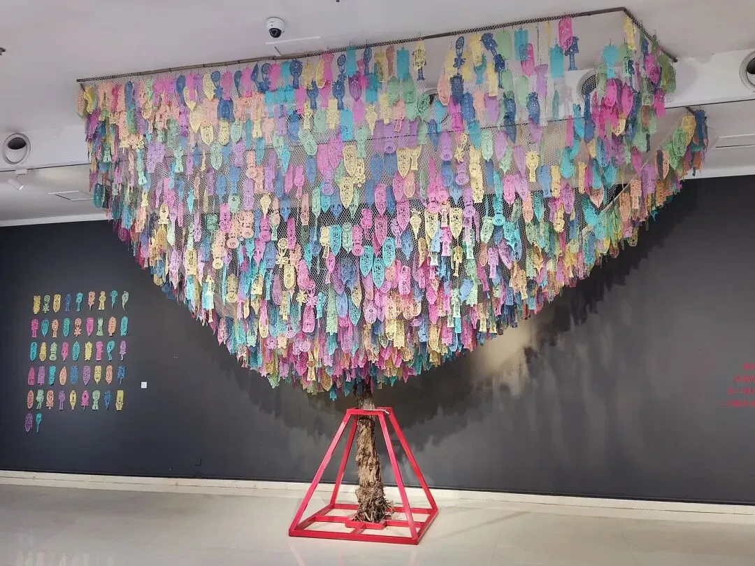 以青瓷承载飞天,既致敬了中华两大文化瑰宝(青瓷工艺、敦煌艺术),也寓意“祥瑞平安、气韵天成”,是当代文化自信的艺术表达。 以唐山博玉骨质瓷为载体,融合高温釉彩与唐三彩的窑变技法,突破传统陶瓷绘画的限制,实现了釉色的自由流淌与色彩碰撞,是当代陶瓷工艺的创新成果;将中国传统敦煌文化、唐代美学与西方抽象表现主义结合,以写意泼彩替代工笔写实,既有东方神韵,又具现代艺术张力。京剧戏服严格遵循“宁穿破,不穿错”的行业准则,通过颜色、纹样、形制,直接区分角色的身份、地位、性格;京剧戏服制作技艺(京绣)、点翠工艺均为国家级非物质文化遗产,这类展陈是对传统戏曲文化、手工技艺的活态传承。 三件马甲以“龙-素-凤”为核心布局,左侧龙纹对应男性皇权,右侧凤纹对应女性至尊,中间素色马甲为过渡,完整呈现清代宫廷男女服饰的等级与文化。 以数万片剪纸组成“祈福树”,既保留了剪纸“祈福纳祥”的文化内核,又通过装置艺术的沉浸式体验,赋予传统工艺全新的生命力。“树”在中华文化中象征“生生不息、枝繁叶茂、福泽绵延”,满树剪纸寓意“福气满盈、万事顺遂”。剪纸以马为核心纹样,契合马年新春主题,寓意“马到成功、一马当先、龙马精神”,承载了大众对新年的美好期许。 国潮武财神