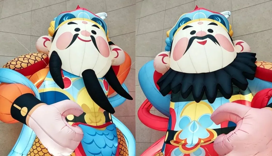 武财神是中国民间信仰的神祇,主流分为赵公明(道教财神,统领五路财神)与关公关圣帝君(武财神、武圣),也常与门神秦琼、尉迟恭形象融合,兼具招财与护宅的双重寓意。正月初五迎财神是中国传统年俗,这类气模是年俗活动的核心氛围道具。