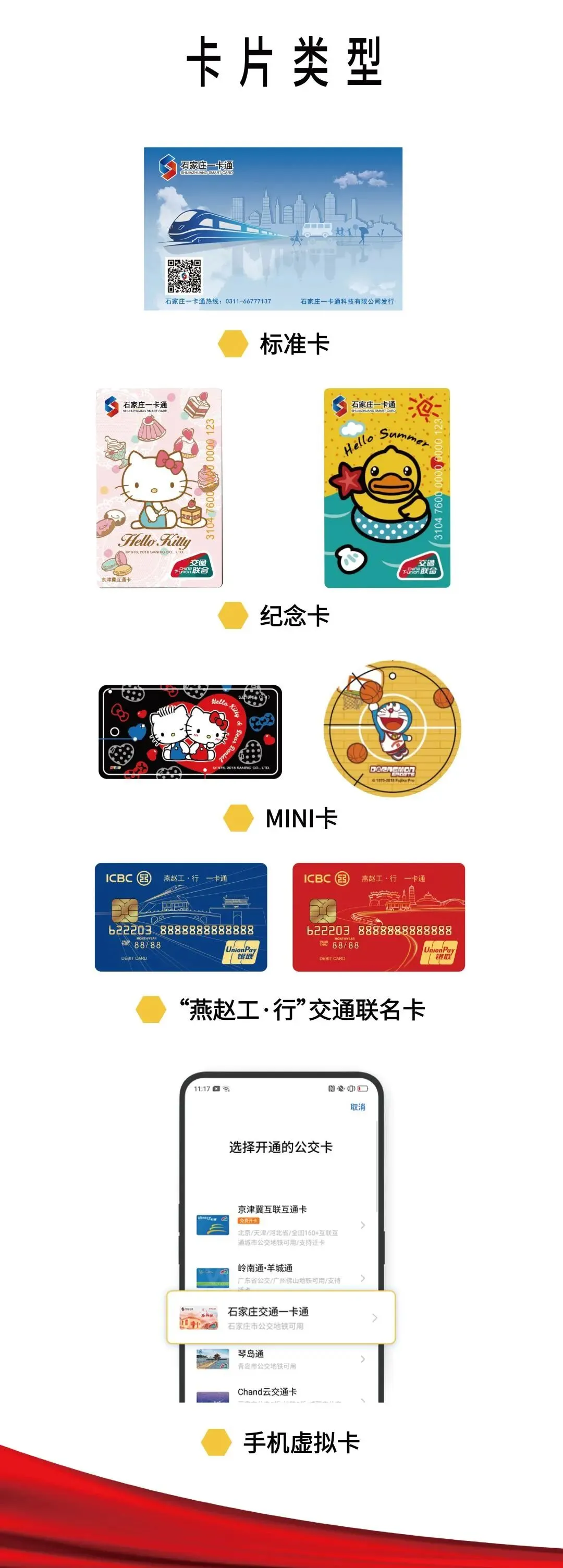 “京津冀互通卡”卡面统一印有“石家庄一卡通”和“交通联合”标识,该卡支持刷卡乘坐全国275个城市的公共交通工具,并涵盖了全国30余个城市的地铁。现已发行标准卡、纪念卡(MINI卡)、手机虚拟卡、“燕赵工·行”交通联名卡等类型。目前已支持微信充值和大型智能自助终端等多项应用。