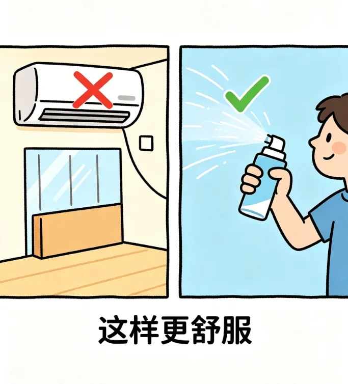 第一个妙招,自制清凉喷雾。准备一个小喷壶,装半壶凉白开,滴 2-3 滴花露水,搅拌均匀,想凉快的时候,往脸上、胳膊上喷一喷,瞬间就有清凉感,还能防蚊虫,比开空调更温和,不会着凉。喷壶要选小一点的,方便拿在手里,随时能喷。