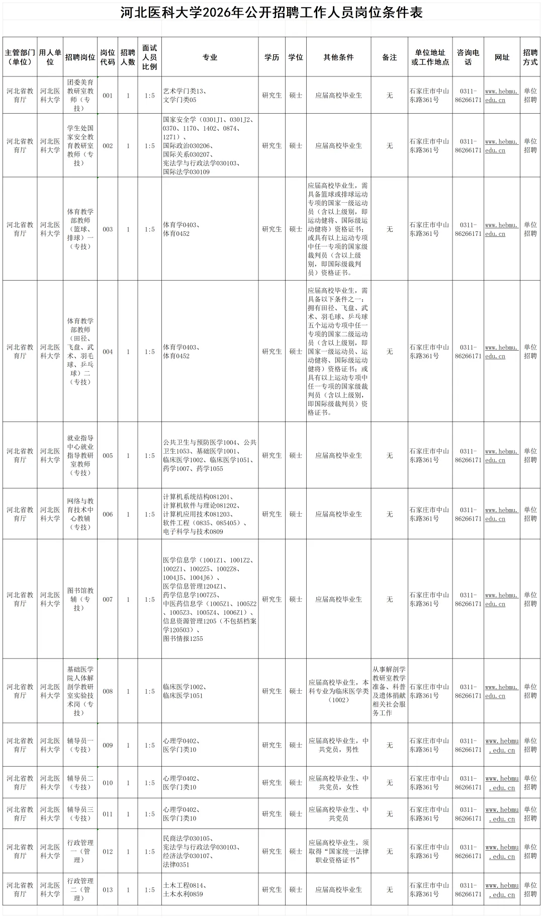 2026年河北医科大学拟公开招聘工作人员13名,其中专业技术岗位人员11名,管理岗位人员2名。具体招聘人数和岗位条件详见《河北医科大学2026年公开招聘工作人员公告》和附件1:《河北医科大学2026年公开招聘岗位条件表》,其中专业参考教育部公布的研究生、本科专业目录设置。对于取得海外院校学历学位或毕业于国内院校自设学科的考生,如专业名称与岗位要求专业名称不完全一致,可由用人单位(部门)根据应聘人员在校期间所学课程、研究领域及毕业院校开具的学科专业证明等材料进行综合研判,严格把握,统一标准,作出决定。