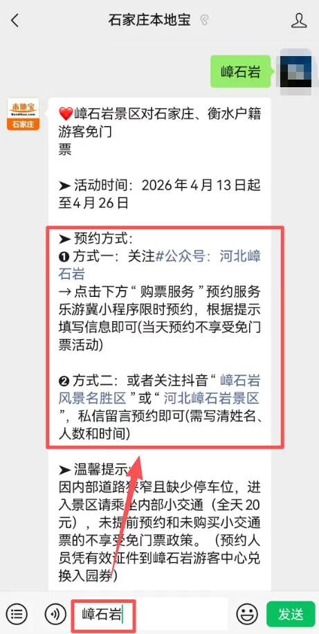 关注【石家庄本地宝】公众号,把菜单栏切换成对话框,私信回复【嶂石岩】,即可获取嶂石岩景区微信预约入口以及抖音号。