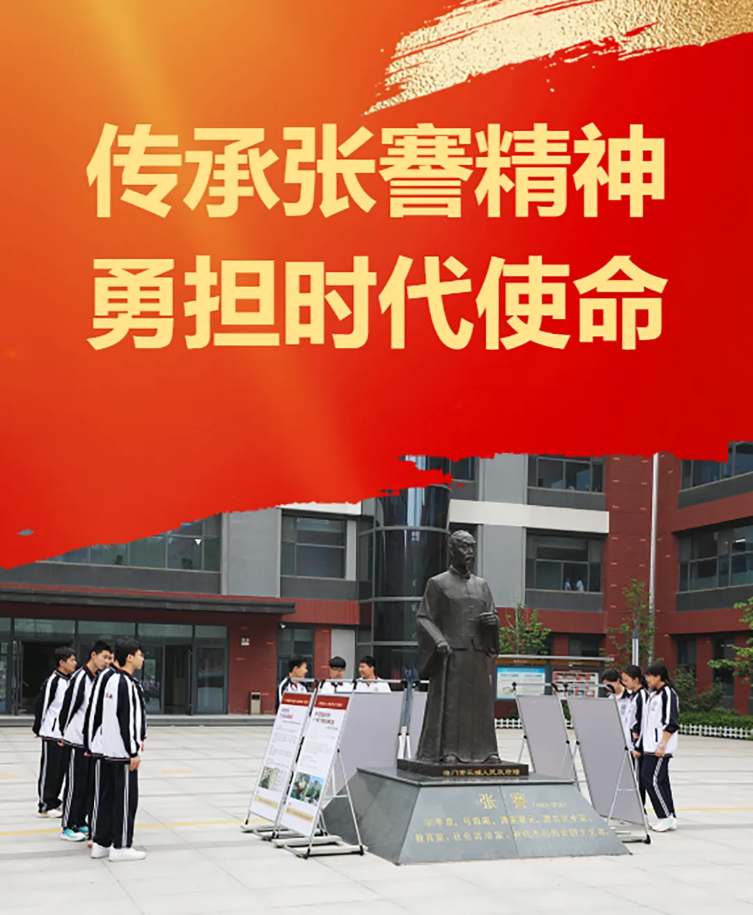 升旗仪式结束后,同学们围到新设的展板前仔细观看。不少同学说,以前每天路过铜像从没认真看过,今天听完演讲、看完展板,对自己平时的言行增加了反思。