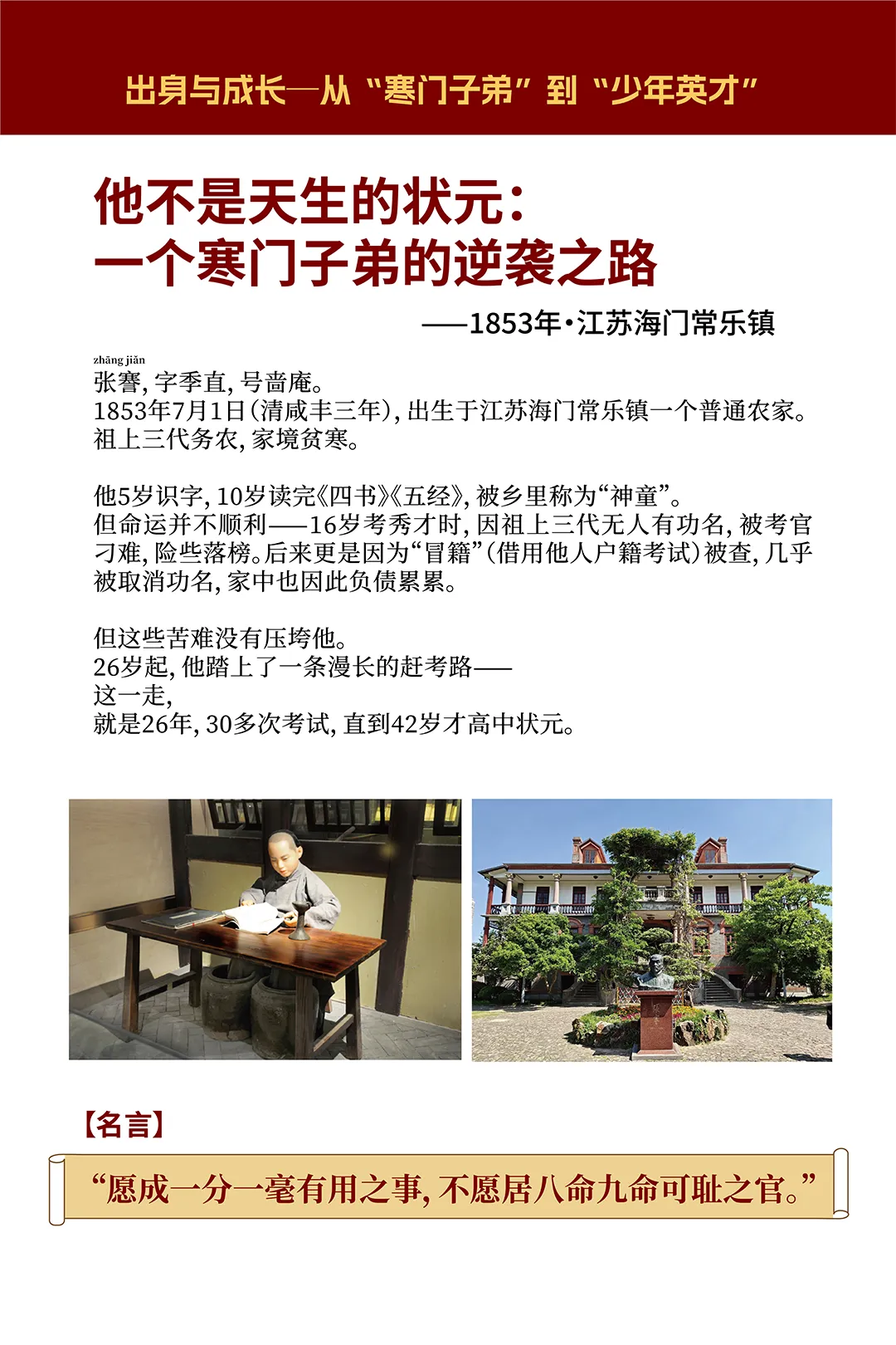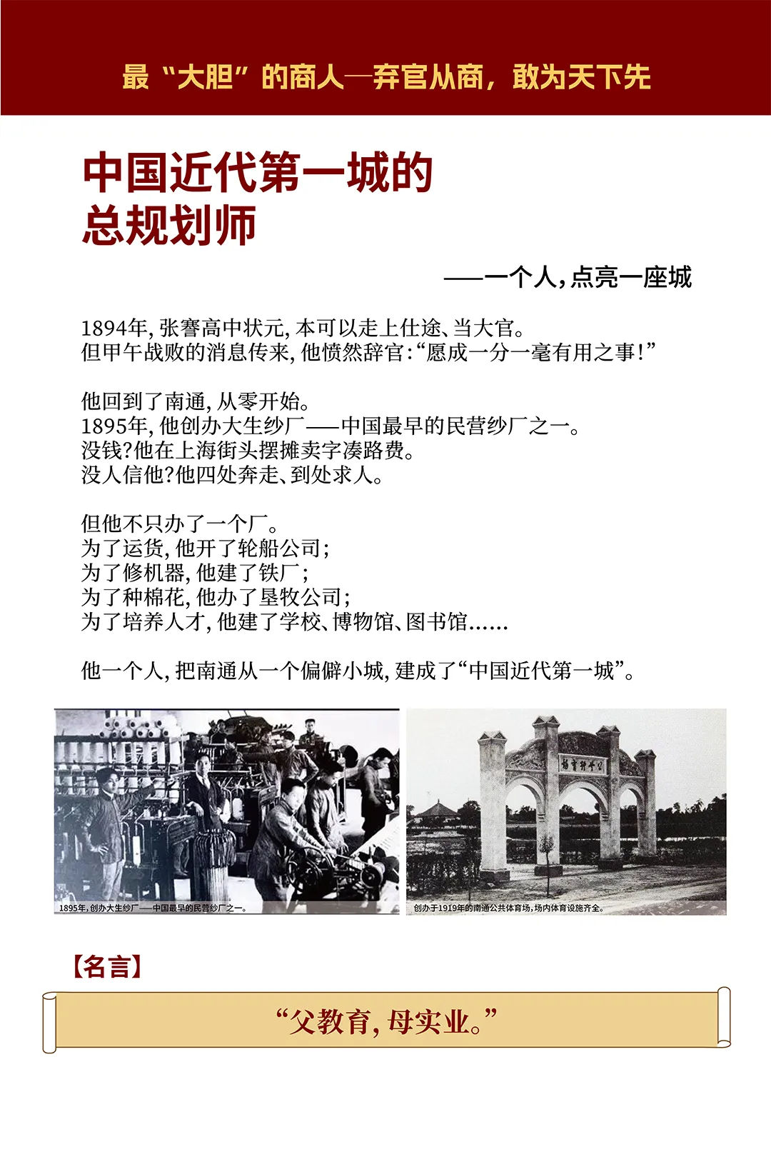 “张謇做什么都能做到最好,不是因为他比别人聪明,而是因为他把每一件小事都做到了极致。”张謇当年连棉花的水分含量都要亲自把关,教室课桌椅的高度都要亲自测量,博物苑地砖缝隙都要求干干净净。一个状元,做最琐碎的活,把每一件小事做到极致。