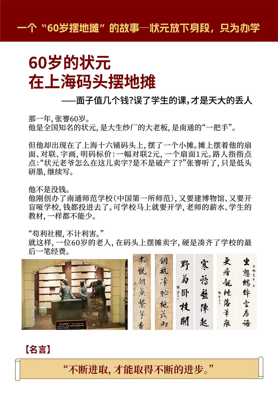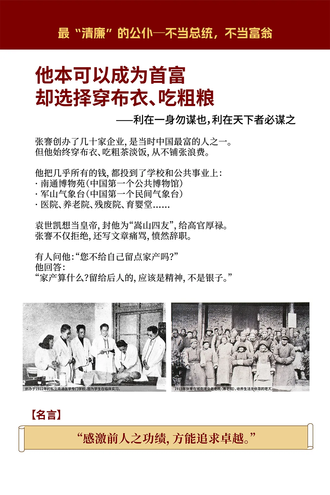 今天,同学们每天计划安排好学习、回到宿舍抓紧时间休息、把课桌收拾整齐、离开教室关灯关空调——把这些小事做到极致,就是在传承张謇精神。