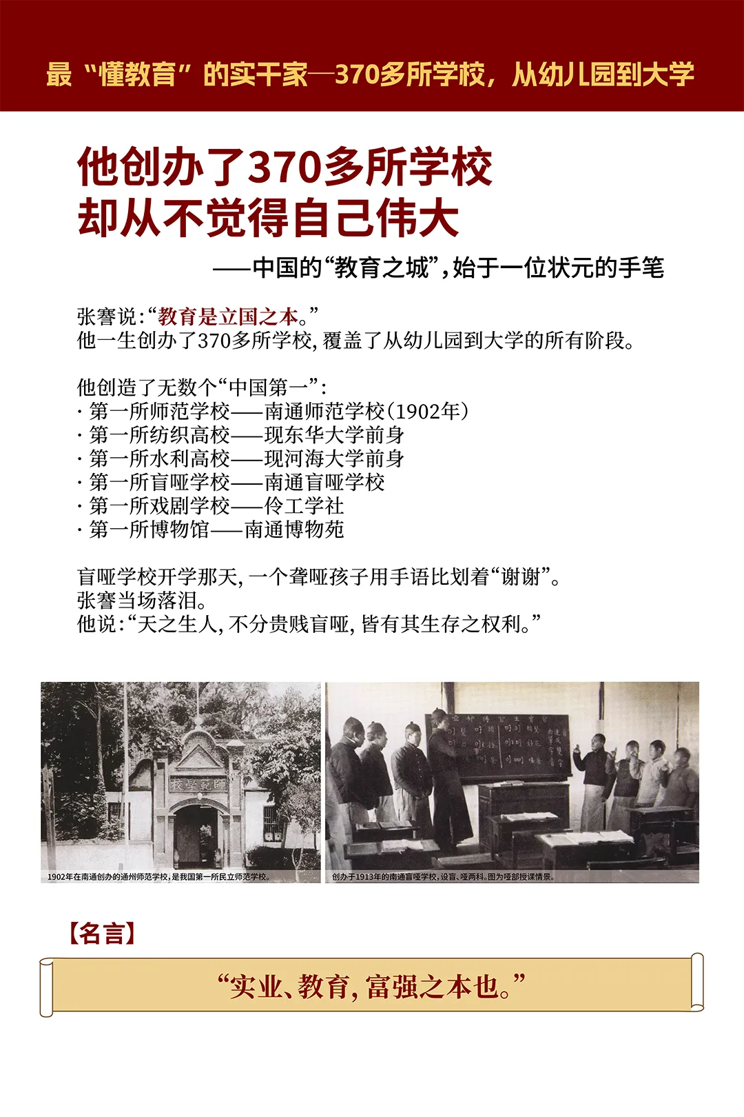 张謇是什么人?4月13日的升旗仪式上,梁健副校长为全校师生做了详细的解答:作为学生,他是状元,考了全国第一;作为实业家,他创办了20多家企业,把南通建成当时中国最现代化的城市;作为教育家,他建了370多所学校,从师范到盲哑学校,从博物苑到纺织专门学校。