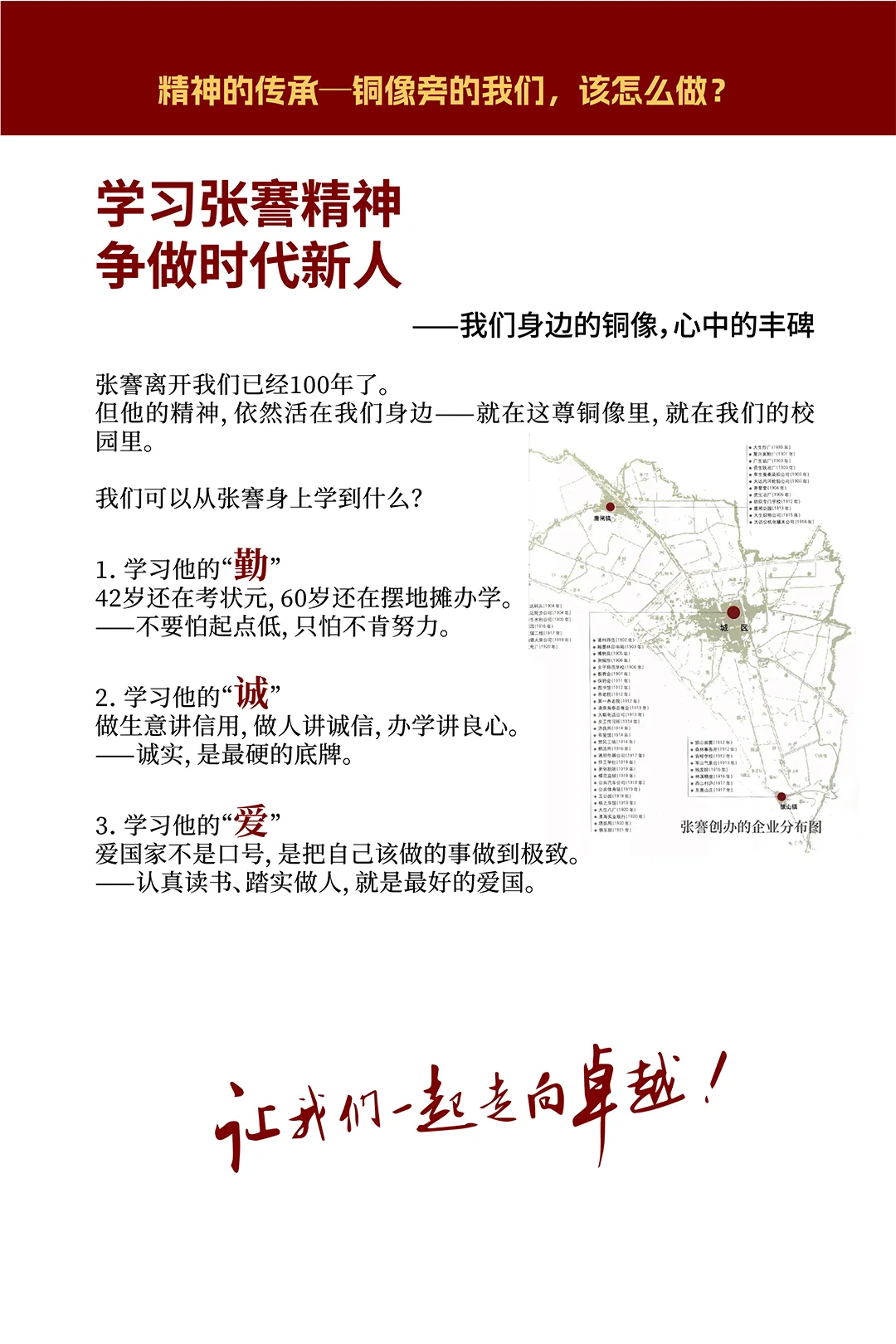 她向全校同学发出号召:以张謇为榜样,做最好的学生,将来做最好的建设者。