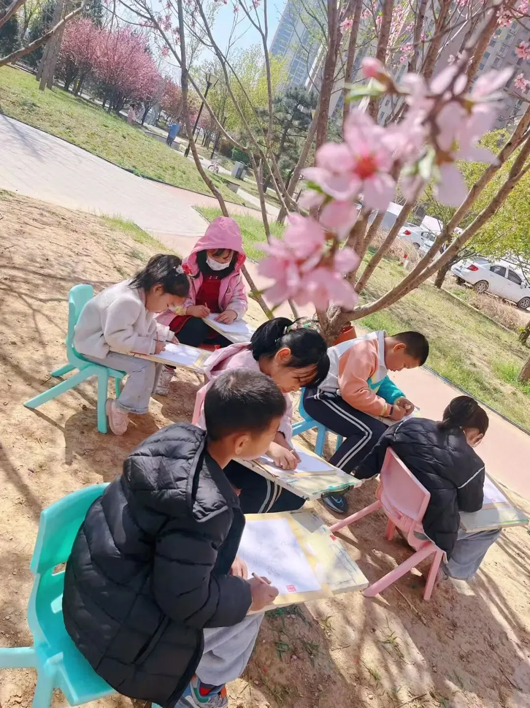 上午8点半到10点10分是女儿的美术课,10点半到12点是儿子的美术课。老师会根据孩子们的年龄和基础安排不同的内容。上星期,老师还带他们去小区附近的小公园采风。