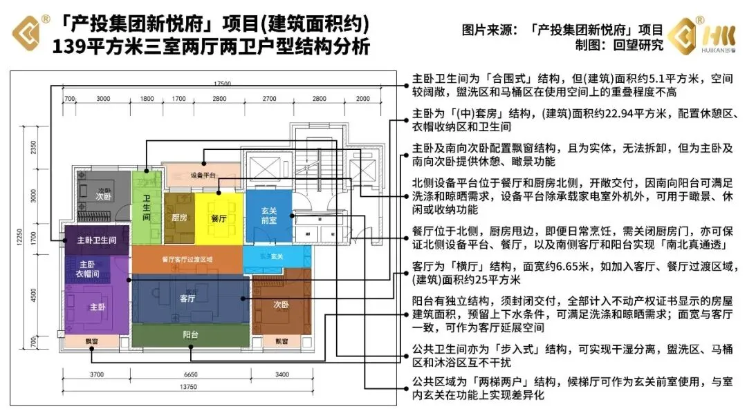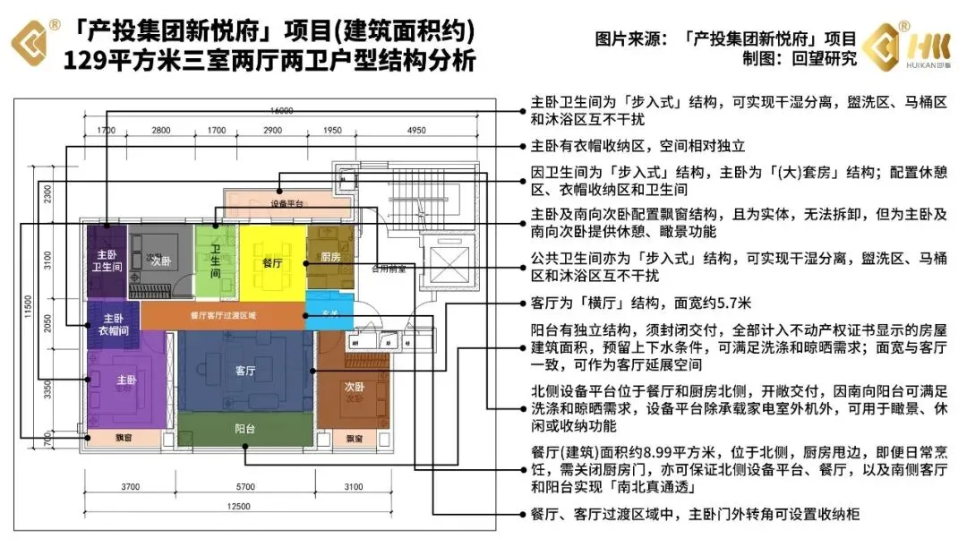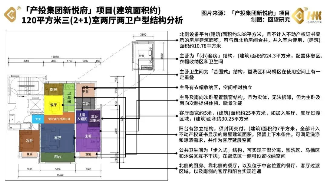 加上产品力新规的加持,南向的飘窗扩展了客厅、主卧的采光空间,北侧的设备平台又给餐厅或者次卧延展了使用空间,让这个项目的户型住起来舒服,算起(得房率)来实惠。