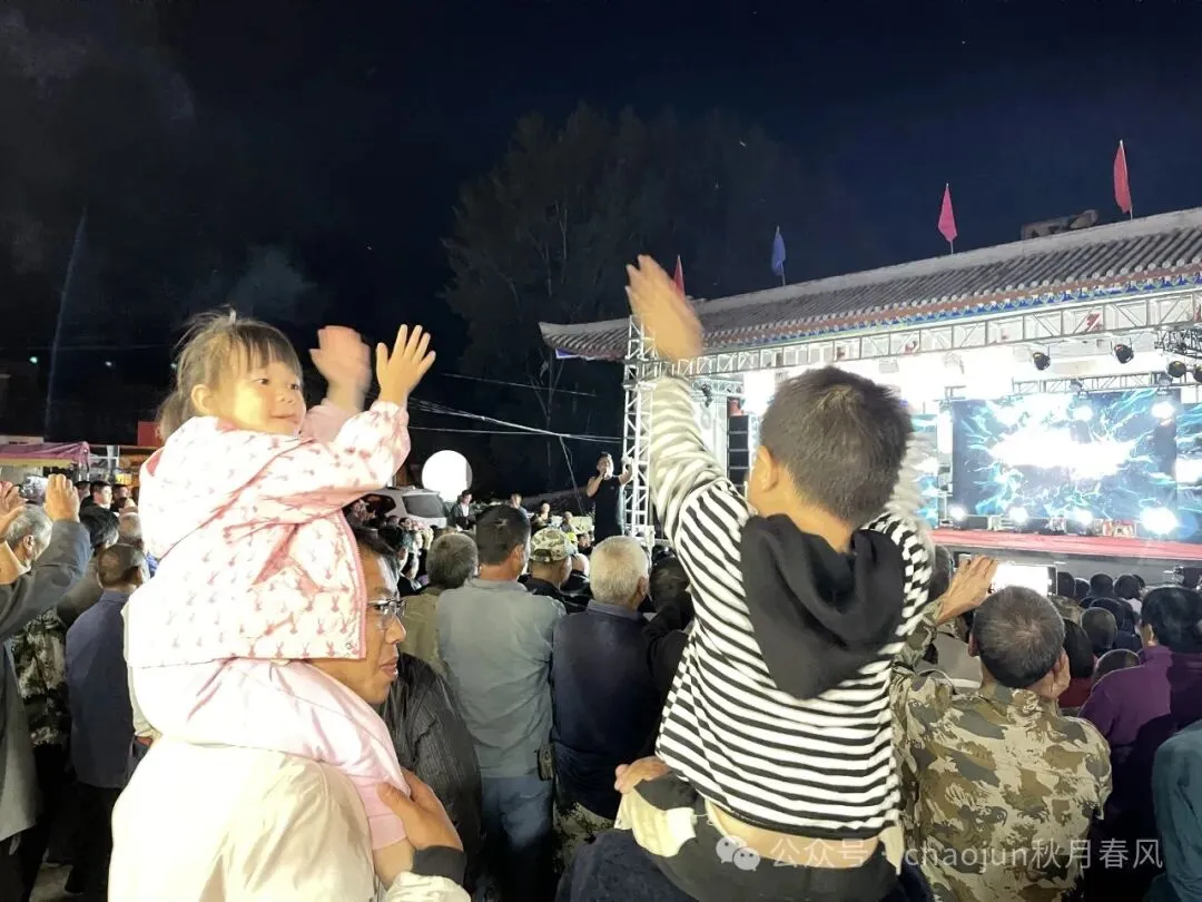20:00到前大地大舞台看庙会的压轴节目歌舞晚会,歌舞晚会男女老幼,人人喜欢,看歌舞晚会的观众远远多于看戏曲的人,演员很卖力气,走到观众中与大家互动,群情高涨,小朋友坐在父亲的肩上,兴奋地鼓掌(图2)。