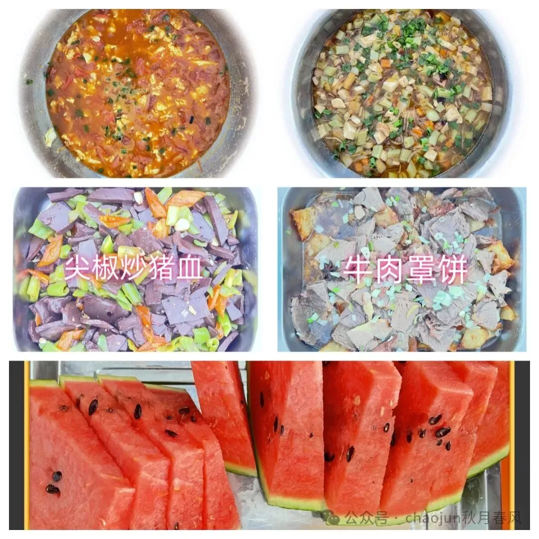 单说饭菜,26日中午主食是面条,餐厅小姑娘说,今天午饭简单。实际情况是,午餐有两个菜、两种卤、两种面。一个菜是牛肉罩饼,饭店的牛肉罩饼,饼多肉少,加肉加钱,今天中午的牛肉罩饼,几乎看不到饼,人家这是纯纯的炖牛肉,一个菜是尖椒炒猪血。一种是茄子豆角肉丁卤,另一种是西红柿鸡蛋卤。一种常规的宽面条,另一种是多彩杂粮饸烙(图4)。通常情况下午餐、晚餐两荤两素,除了面条,这两天吃过的主食有米饭、馒头、花卷、玉米面发糕、蒸红薯、蒸南瓜,大碴子粥、小米粥、疙瘩汤、炸油条、锅塌饼等等,三天下来,中午餐均吃到了甜甜的西瓜,在这吃饭,荤菜素菜统统管够,去的早些晚些,一个样。
