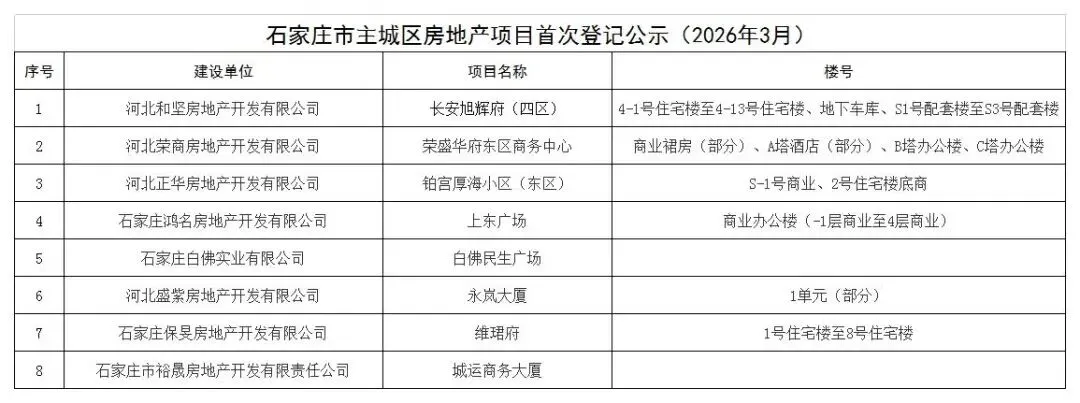 房地产项目首次登记公示信息,石家庄市主城区长安旭辉府(东区)、铂宫厚海小区(东区)、维珺府等