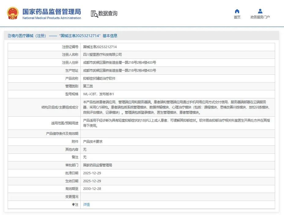 申办方研发的成年人心理治疗软件,由国家精神疾病医学中心、国家精神心理疾病临床医学研究中心、中南大学湘雅二医院牵头,全国11家医院参与,严格验证了疗效、安全性,获得国家药监局审批的医疗器械注册证。本次青少年临床试验产品,经过8年时间打磨,13次严谨的内部试验,数万名学生参与,预计能取得成年人临床同样的效果。