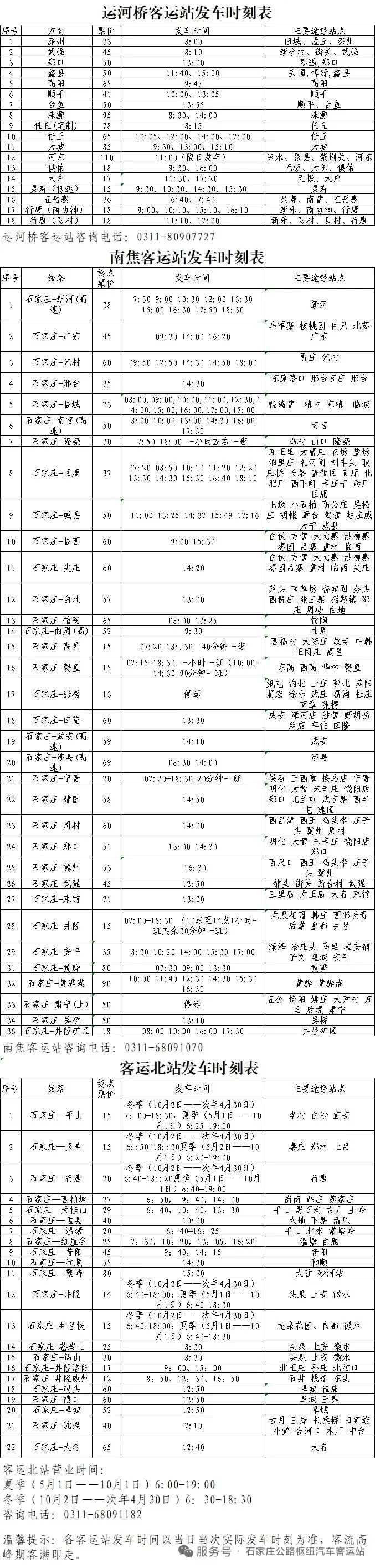 【信息转载】石家庄市运河桥客运站、南焦客运站、客运北站发车时刻表(2026年4月13日更新)