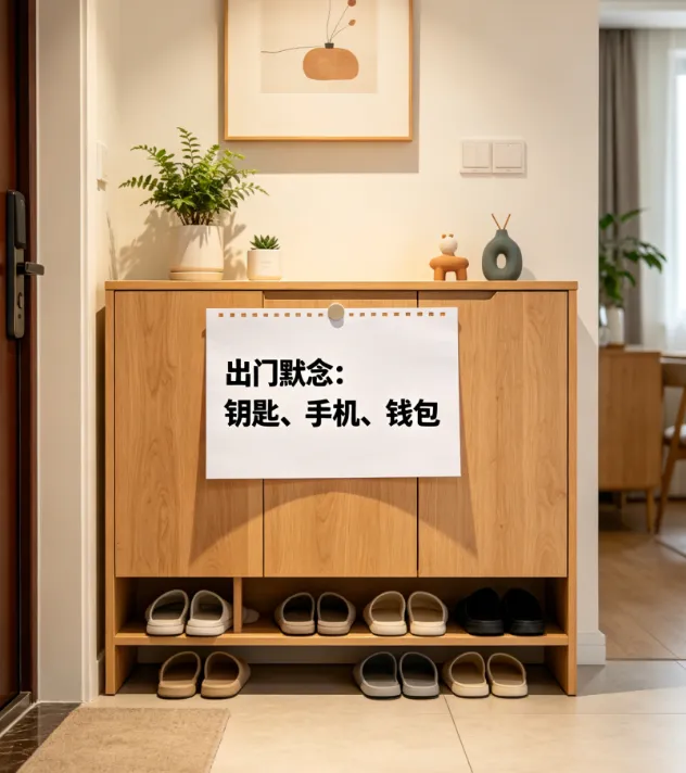 1. 出门前,默念三遍“钥匙、手机、钱包”,就像门口玄关贴的提醒一样,养成检查的习惯,从根本上避免忘带钥匙;