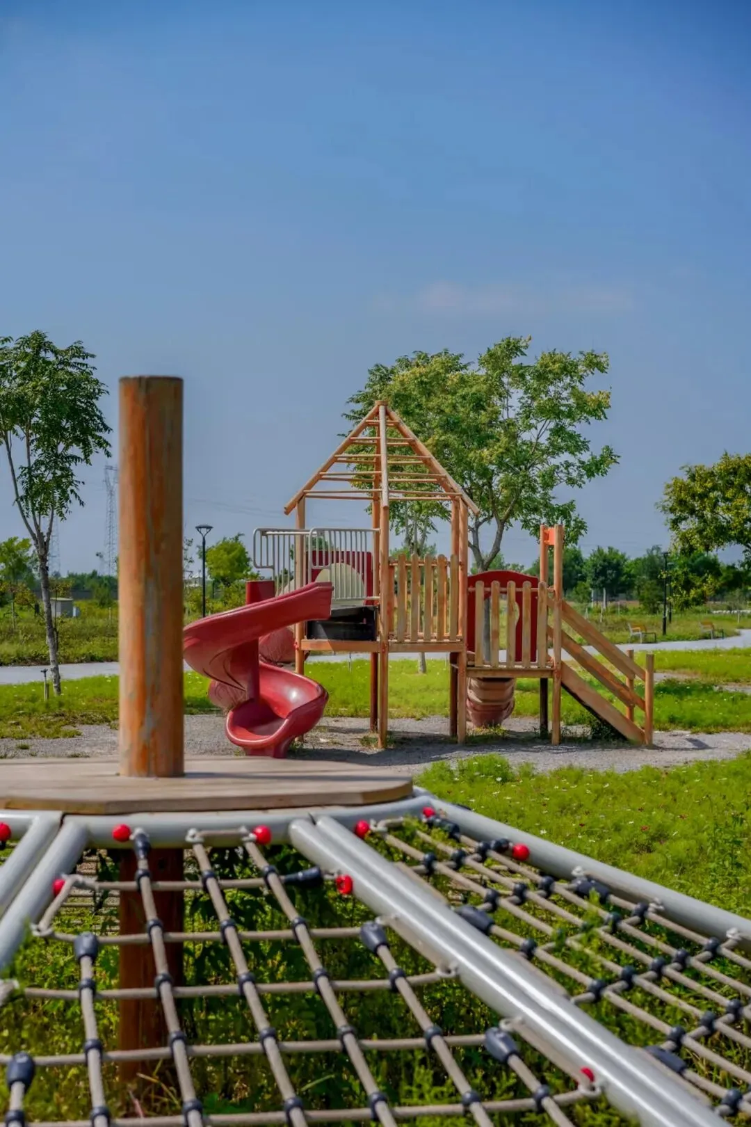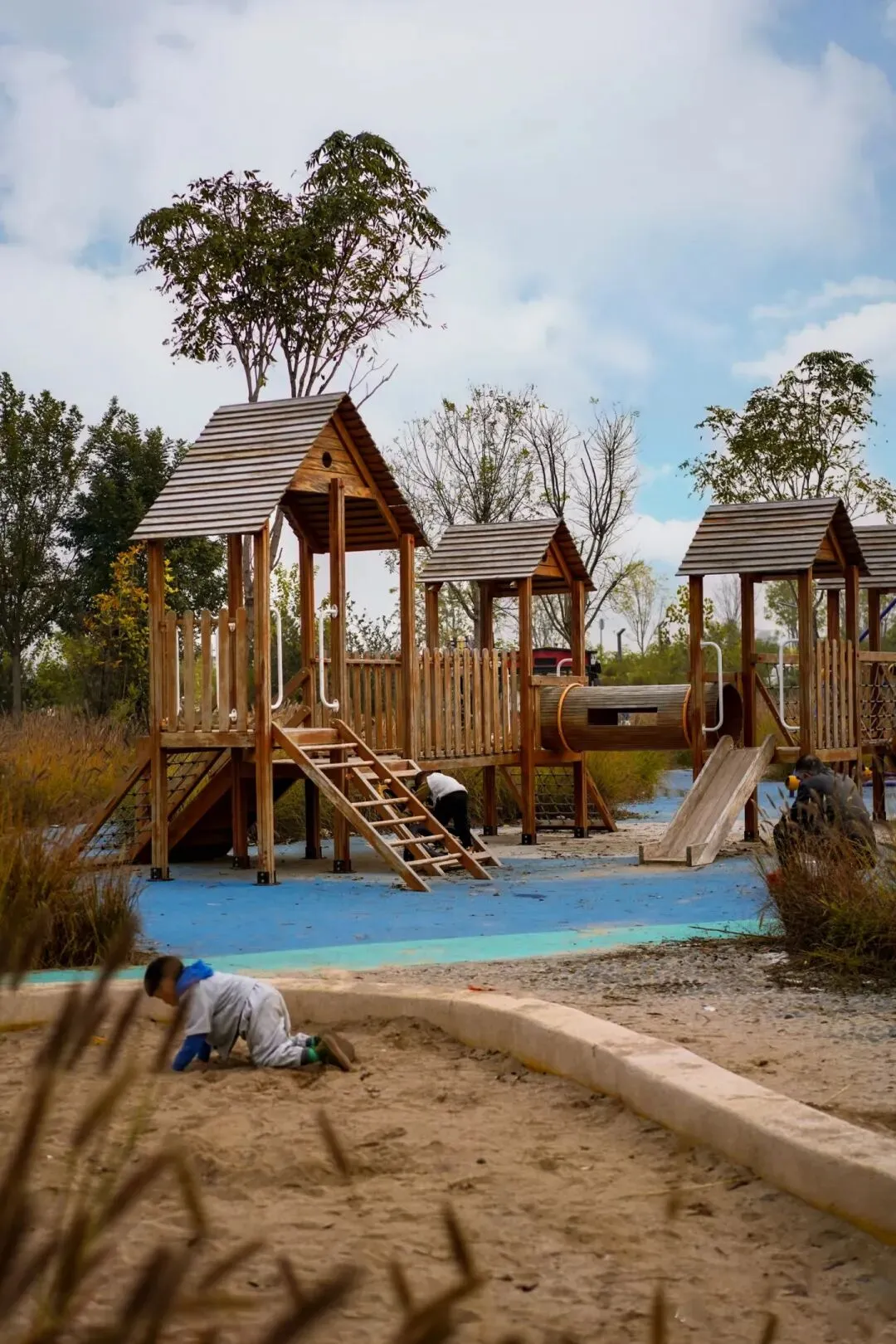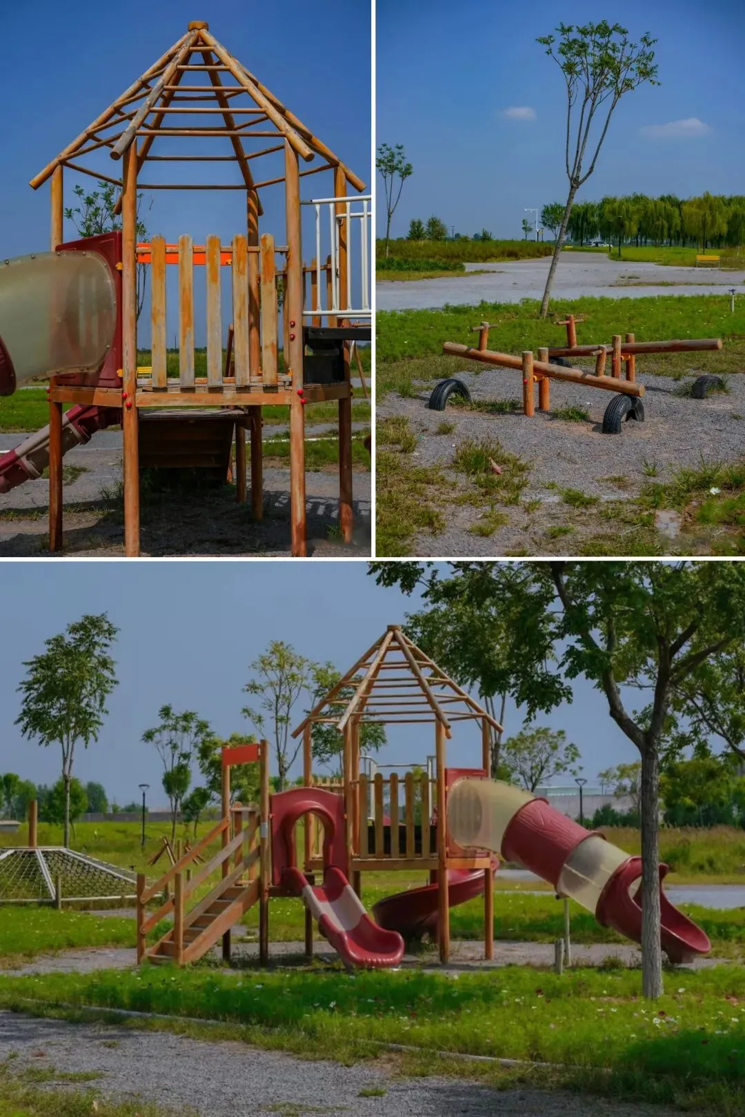 木制的滑梯爬架、秋千、沙池被狼尾草团团包围,自然野趣。这个村边的小乐园平时基本只有附近的孩子来玩,卫生维护不怎么到位,沙池有两座露天和遮阳亭下各一处,可能池里落叶垃圾会比较多。来涌月湖,倾井庄露营玩水可以打卡这里。
