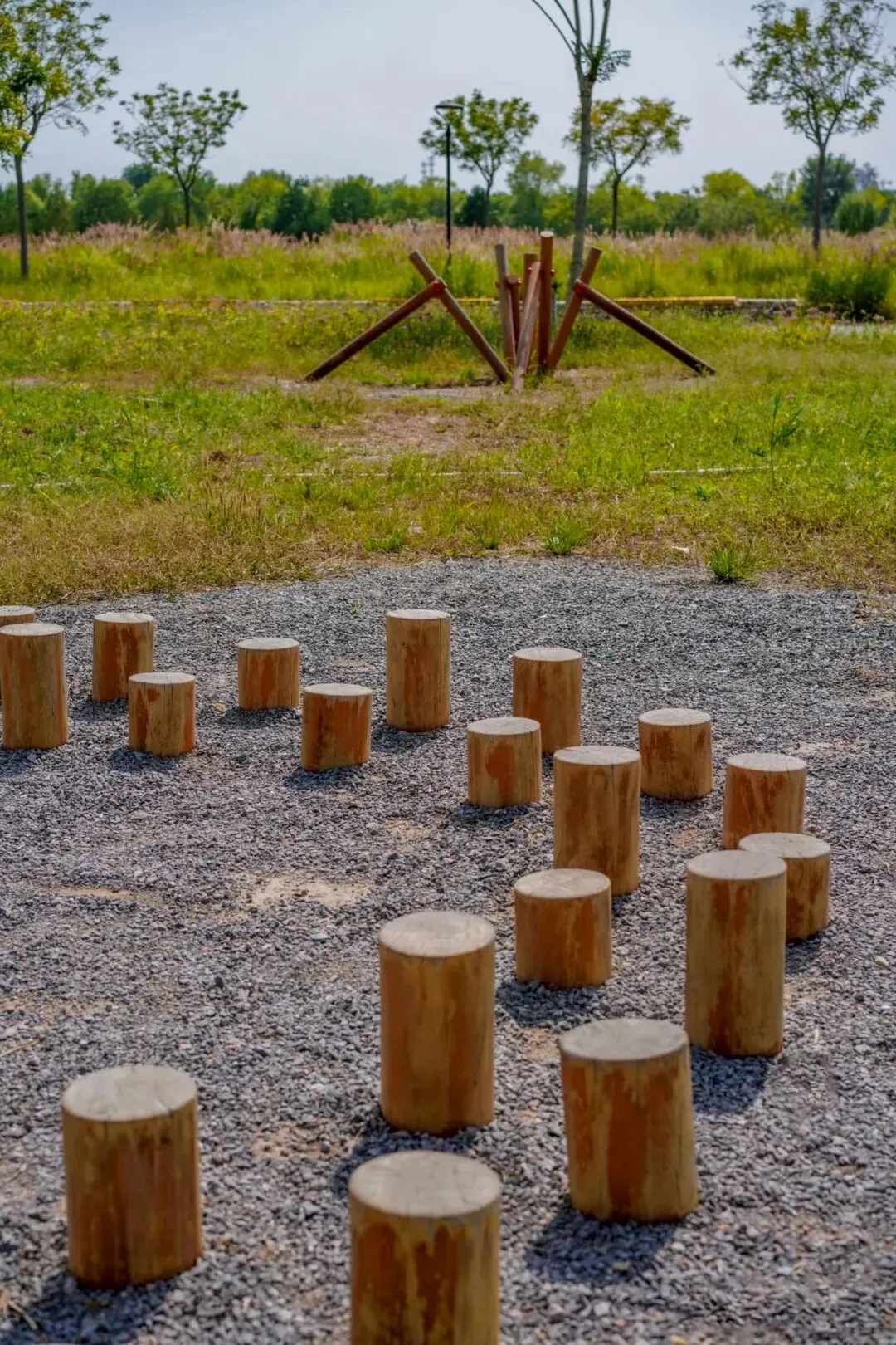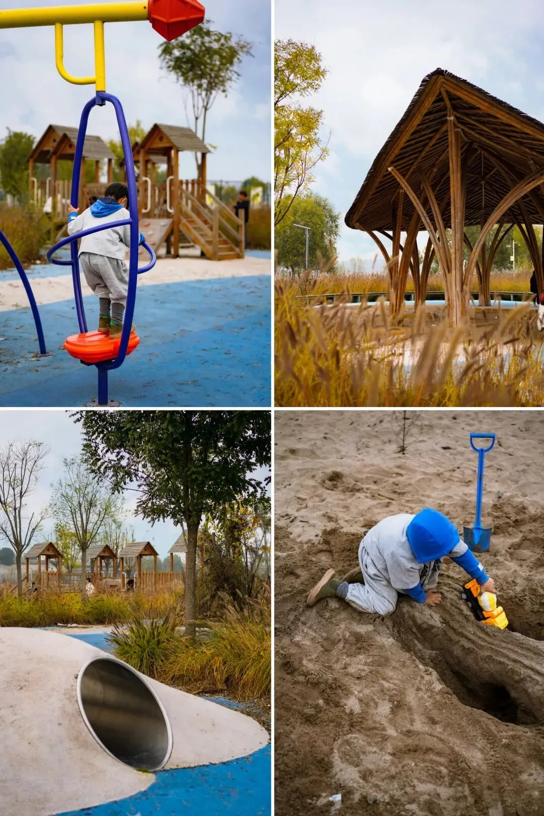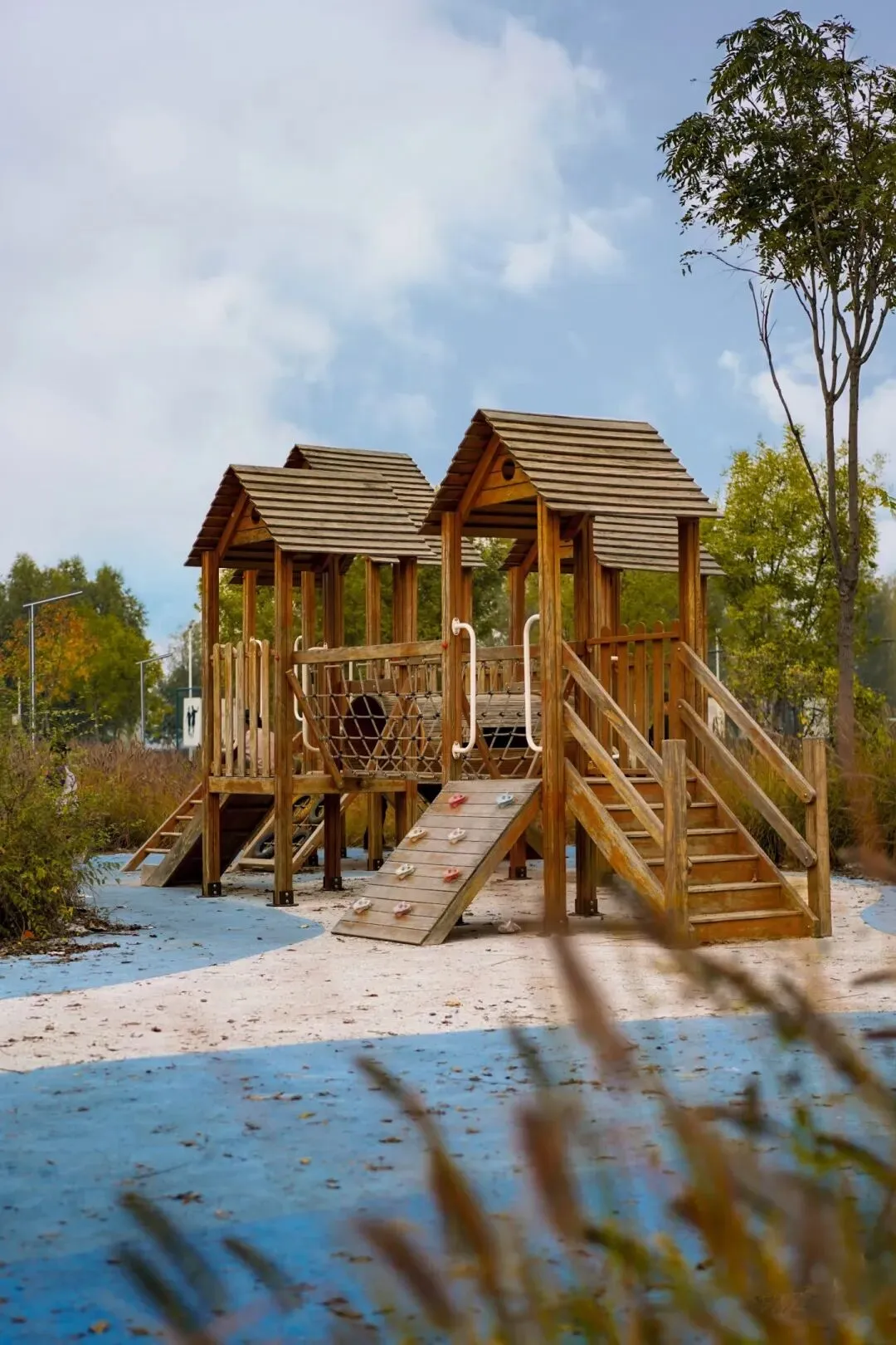 木制的滑梯爬架、秋千、沙池被狼尾草团团包围,自然野趣。这个村边的小乐园平时基本只有附近的孩子来玩,卫生维护不怎么到位,沙池有两座露天和遮阳亭下各一处,可能池里落叶垃圾会比较多。来涌月湖,倾井庄露营玩水可以打卡这里。