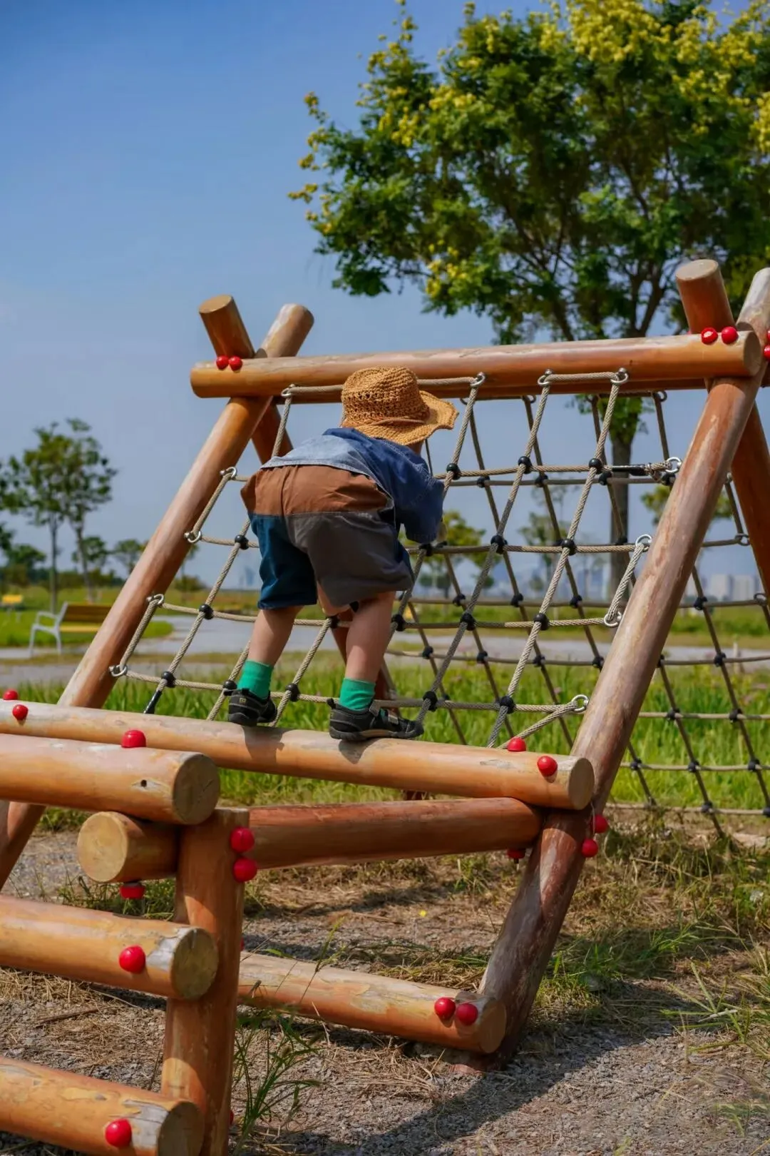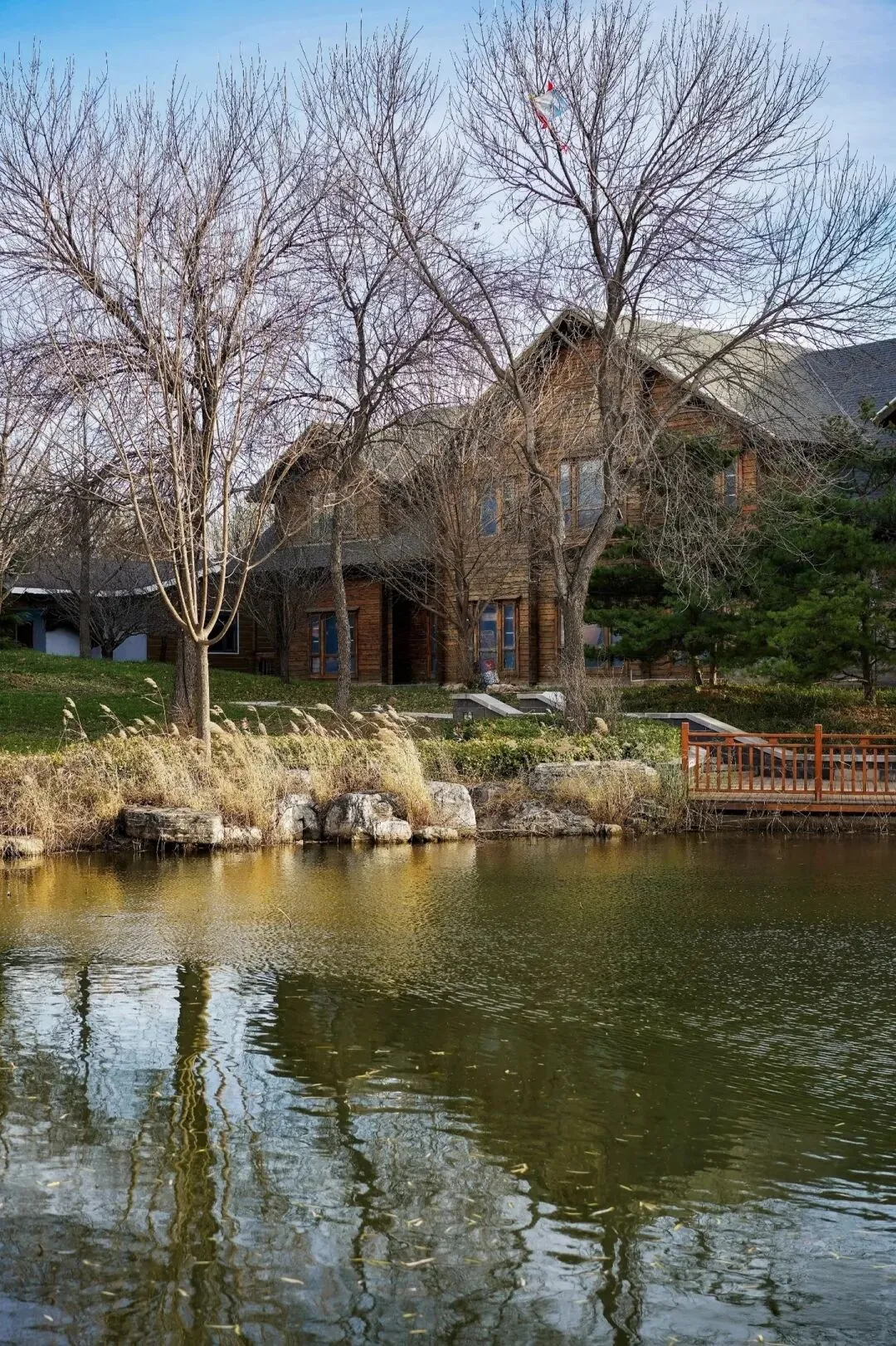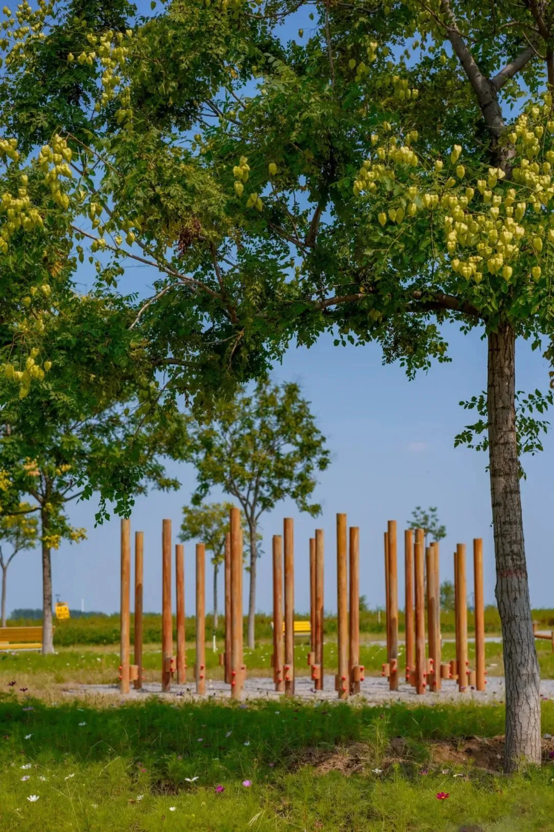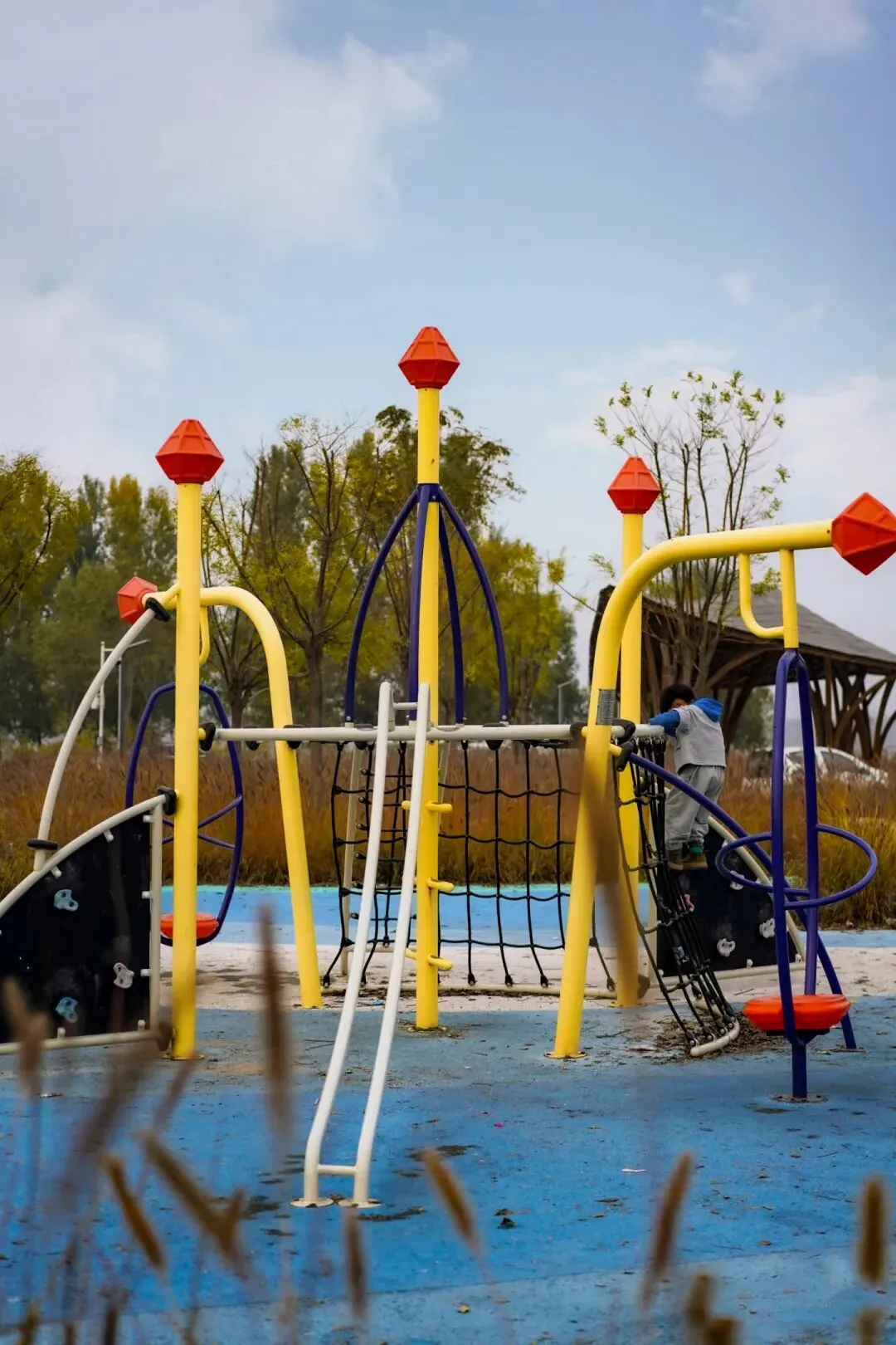 这里设施都是木制,和蓝天白云空旷花田映衬在一起透着一股特别的秀气,但没有大树会比较晒。乐园和滹沱河之间夹着一条水塘,往东边去有不少人在钓鱼。水塘上的黄色木桥拍照很出片,但护栏有缺失,带小朋友注意安全。
