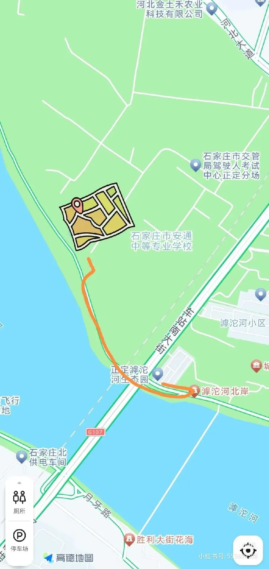 可导航“滹沱河滨水生态公园东北停车场”,到达后向右后方掉头向西从桥下穿过,见到第一个下道口右转下坡就到了。