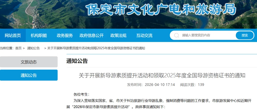 为深入贯彻落实国家、省、市关于纠治旅游行业导游乱象、强制消费等问题的工作要求,市旅游发展中心拟近期开展“2026年保定市新导游素质提升活动”。具体事宜通知如下:
