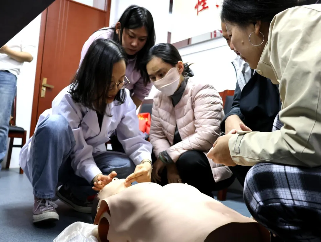 活动现场,王荣老师围绕心肺复苏核心知识展开系统讲解,从急救场景判断、标准操作流程到关键注意事项,逐一细致拆解,并通过亲身示范,规范演示每一个操作动作,让专业急救知识变得直观易懂。福利院工作人员全程专注听讲、认真观摩,紧跟教学节奏积极投入学习。理论讲解与示范完成后,王荣、孔静两位老师分组开展实操教学,指导工作人员借助医用假人进行现场演练,手把手纠正不规范动作,细化按压位置、频率、力度等操作要点。参与人员学习热情高涨,反复练习巩固技能,切实掌握心肺复苏实操方法,现场学习氛围浓厚有序。