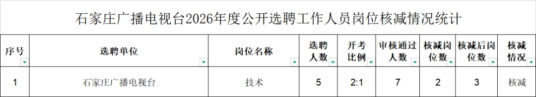 根据石家庄广播电视台2026年度公开选聘工作人员公告要求,各选聘岗位报名人数与选聘计划数比例不得低于2:1,达不到开考比例的,按比例减少该岗位选聘人数直至取消该岗位的选聘。按照以上核减原则,对技术岗位予以核减。