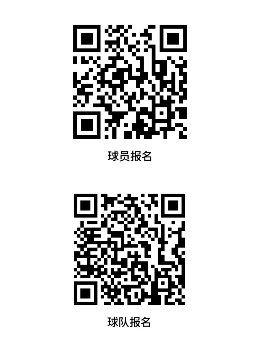 (1)球队负责人先扫描“球队填报”二维码完成球队组建,待球队审核通过后,由球员家长扫描“球员信息填报”二维码填报球员信息。