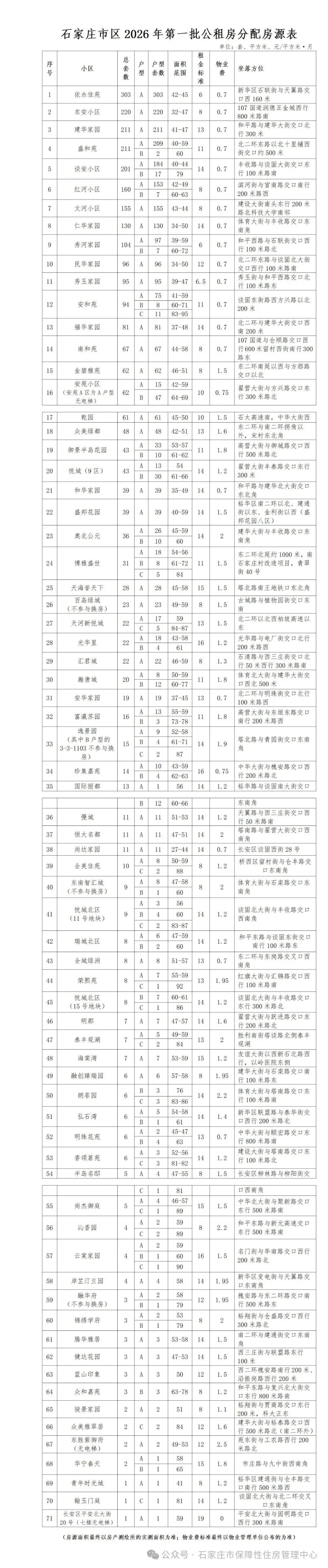 此次配租的公共租赁住房共涉及71个小区,具体房源套数、面积范围、租金及物业费标准、小区坐落等情况如下: