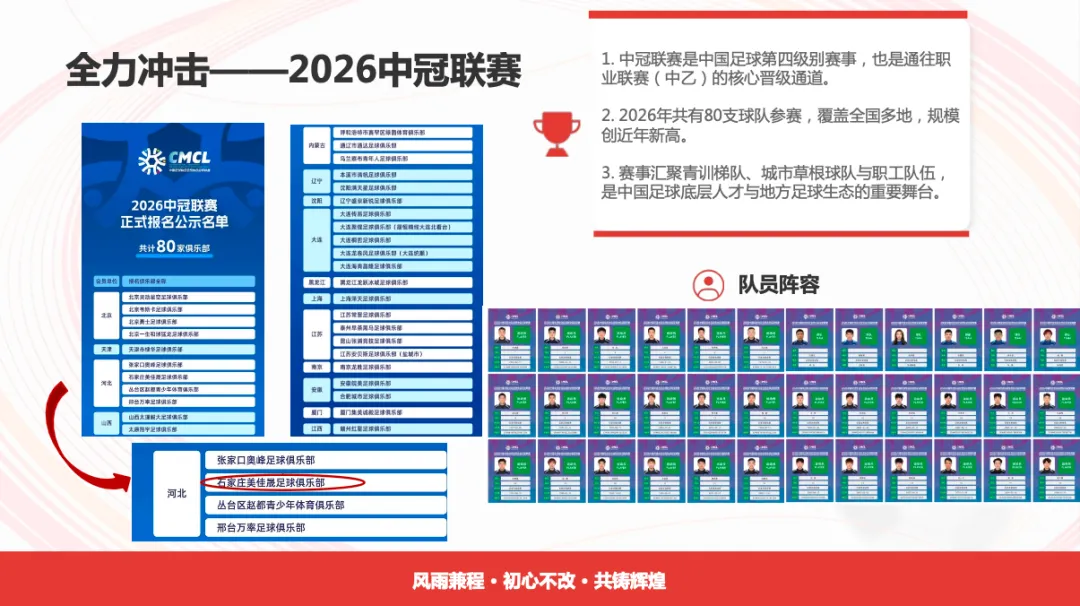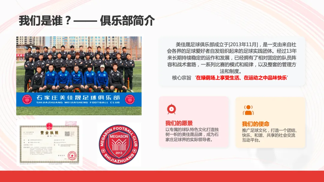对于河北的球迷而言,石家庄美佳晟在河北的足球圈里并不陌生。在上届河北省足球联赛中,石家庄美佳晟获得第三名,获得了晋级中国足球协会冠军联赛(中冠联赛)的推荐资格,而他们也将参与到本赛季的中冠联赛,向职业足球联赛发起冲击。美佳晟足球俱乐部成立于[2013年11月],是一支由来自社会各界的足球爱好者自发组织起来的足球实践团体。经过13年来长期持续稳定的运作和发展,已经拥有了相对固定的队员阵容和战术套路,一系列比赛的模式和规律,以及整套的管理方法和制度。