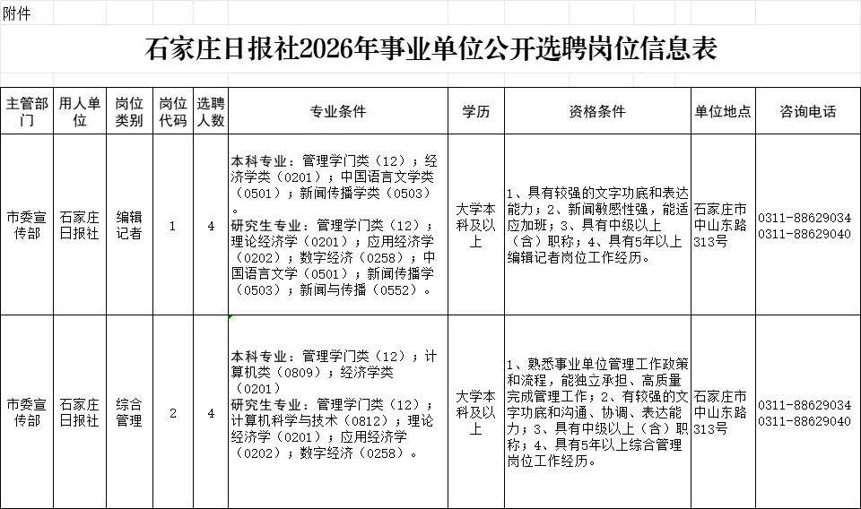本次共选聘事业单位工作人员8名,其中编辑记者岗位4名、综合管理岗位4名。岗位要求详见《石家庄日报社2026年事业单位公开选聘岗位信息表》(见附件)。